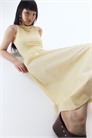 Платье длиной до щиколотки с приталенным лифом из мягкого джерси и расклешенной юбкой из воздушного хлопкового полотна. Силуэт без рукавов, нежный вырез-лодочка и сборка на талии. Без подкладки.