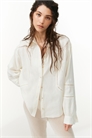 Рубашка воздушного плетения из вискозной смеси с кружевными вставками в виде лесенки. Отложной воротник, пуговицы спереди, слегка спущенные плечи и длинные рукава с манжетами на пуговицах. Подол прямого кроя с закругленными боковыми вентиляционными отверстиями.