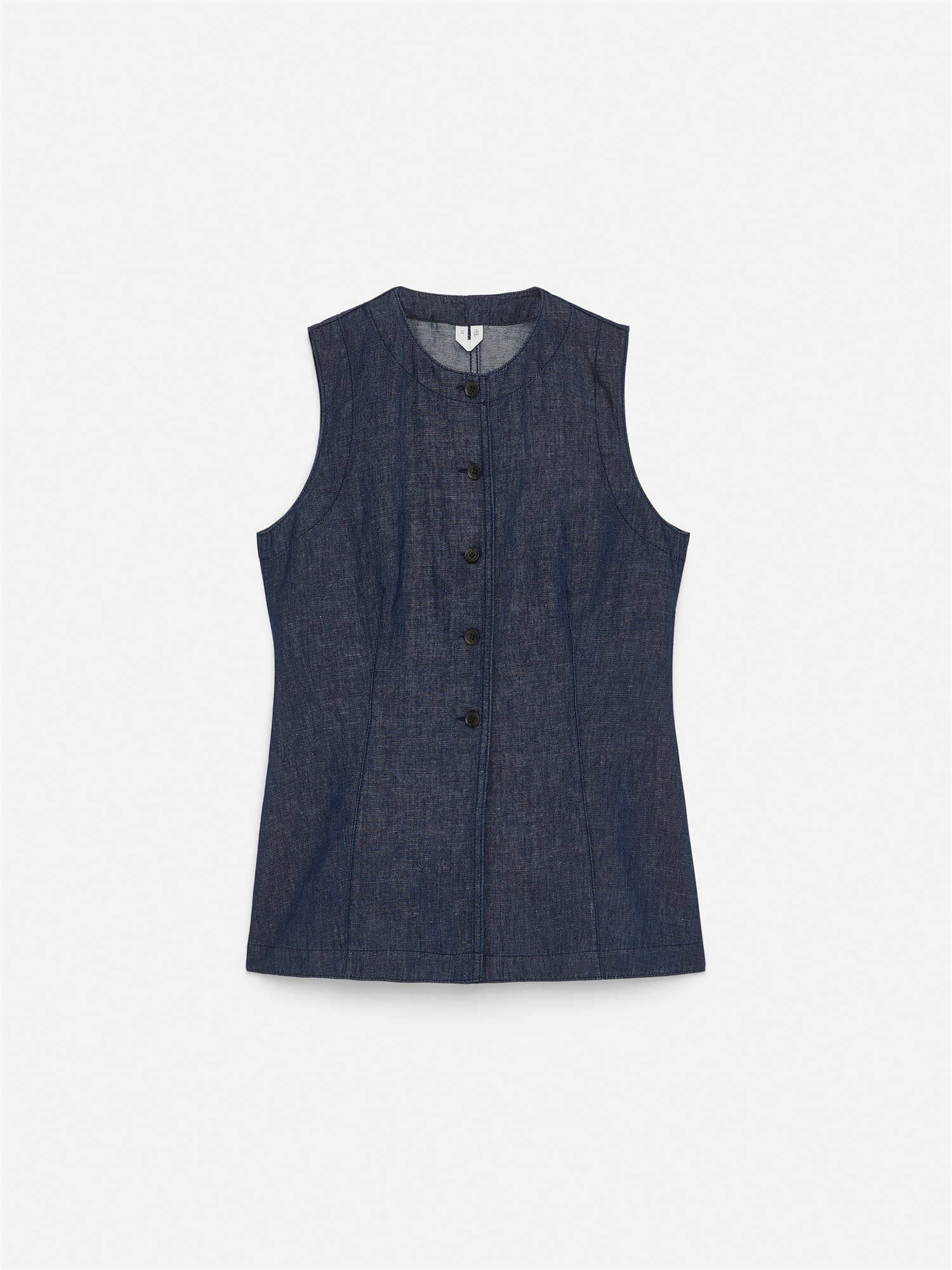 Приталенный джинсовый жилет из смеси хлопка и льна. Застежка на пуговицы. Обычный крой.