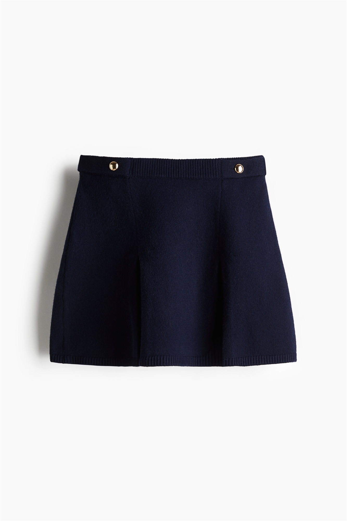 Короткая приталенная юбка из мягкого тонкого трикотажа с перевернутыми складками спереди, создающими мягкий расклешенный силуэт А-линии. Высокая талия с эластичной тесьмой и декоративной планкой со сферической металлической пуговицей с каждой стороны.