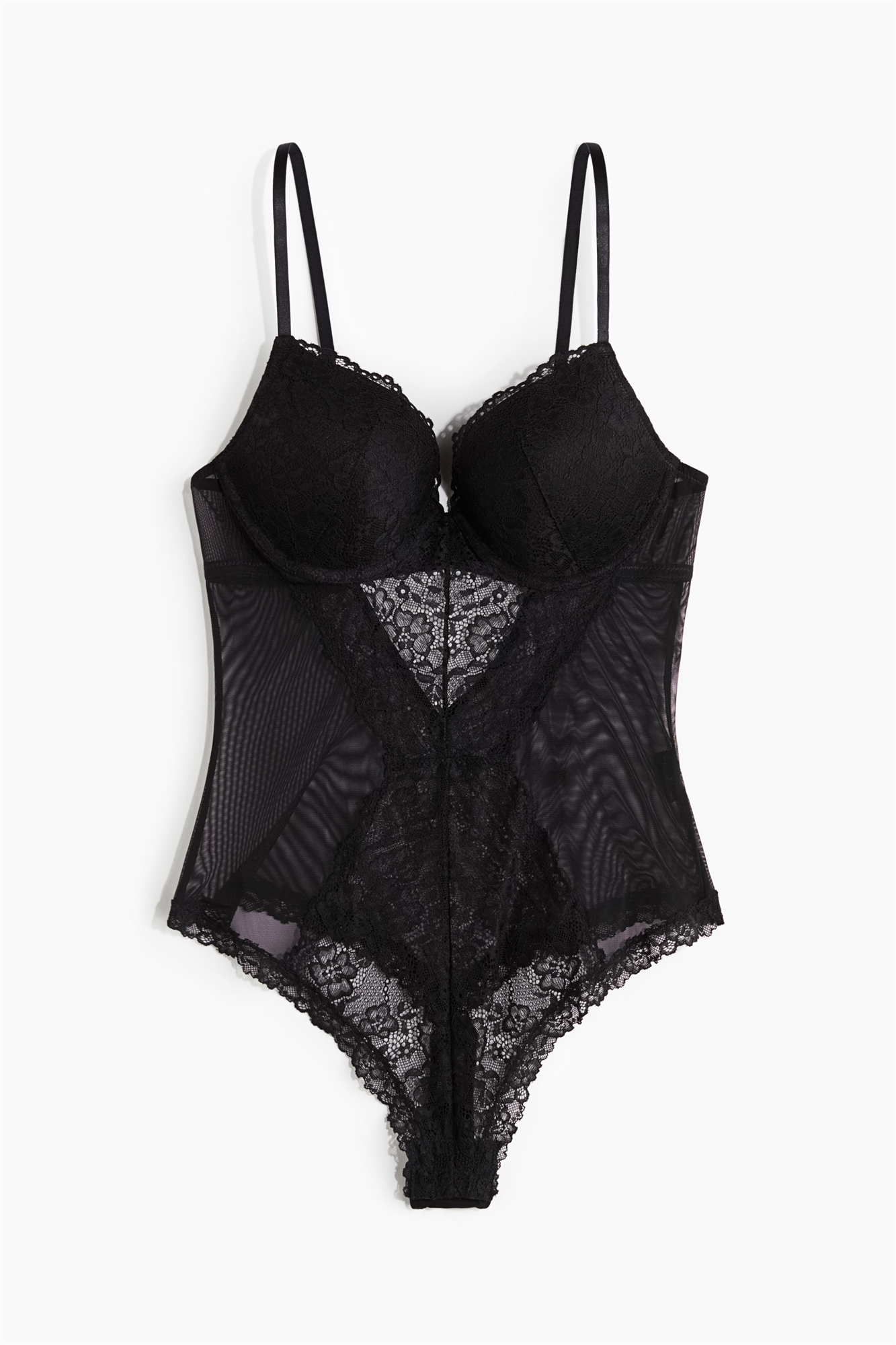 Боди стринги из кружева и сетки с бюстгальтером пуш-ап. Регулируемые бретели и мягкие чашечки с заниженной талией для увеличения объема бюста и декольте. V-образная пройма и застежка на крючки и глазки сзади. Ластовица на подкладке с потайными кнопками.