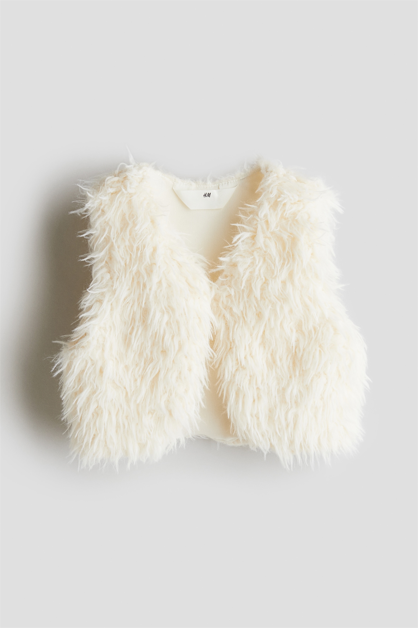 Жилетка из мягкой пушистой ткани с V-образным вырезом и потайной пуговицей в верхней части. Подкладка из джерси.