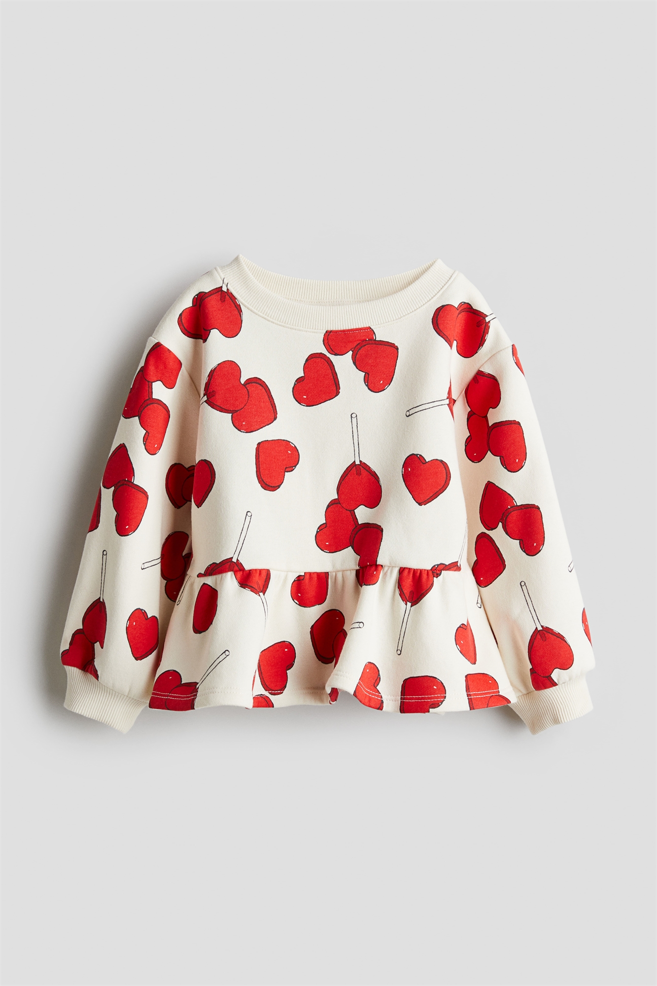Топ из принтованной толстовки с мягким начесом внутри. Круглый вырез с ребристой отделкой, длинные рукава, манжеты в рубчик и пеплум.