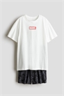 Пижама из мягкого трикотажа с рисунком. Футболка с круглым вырезом с ребристой отделкой и спущенными плечами. Шорты длиной до колена с эластичной талией.