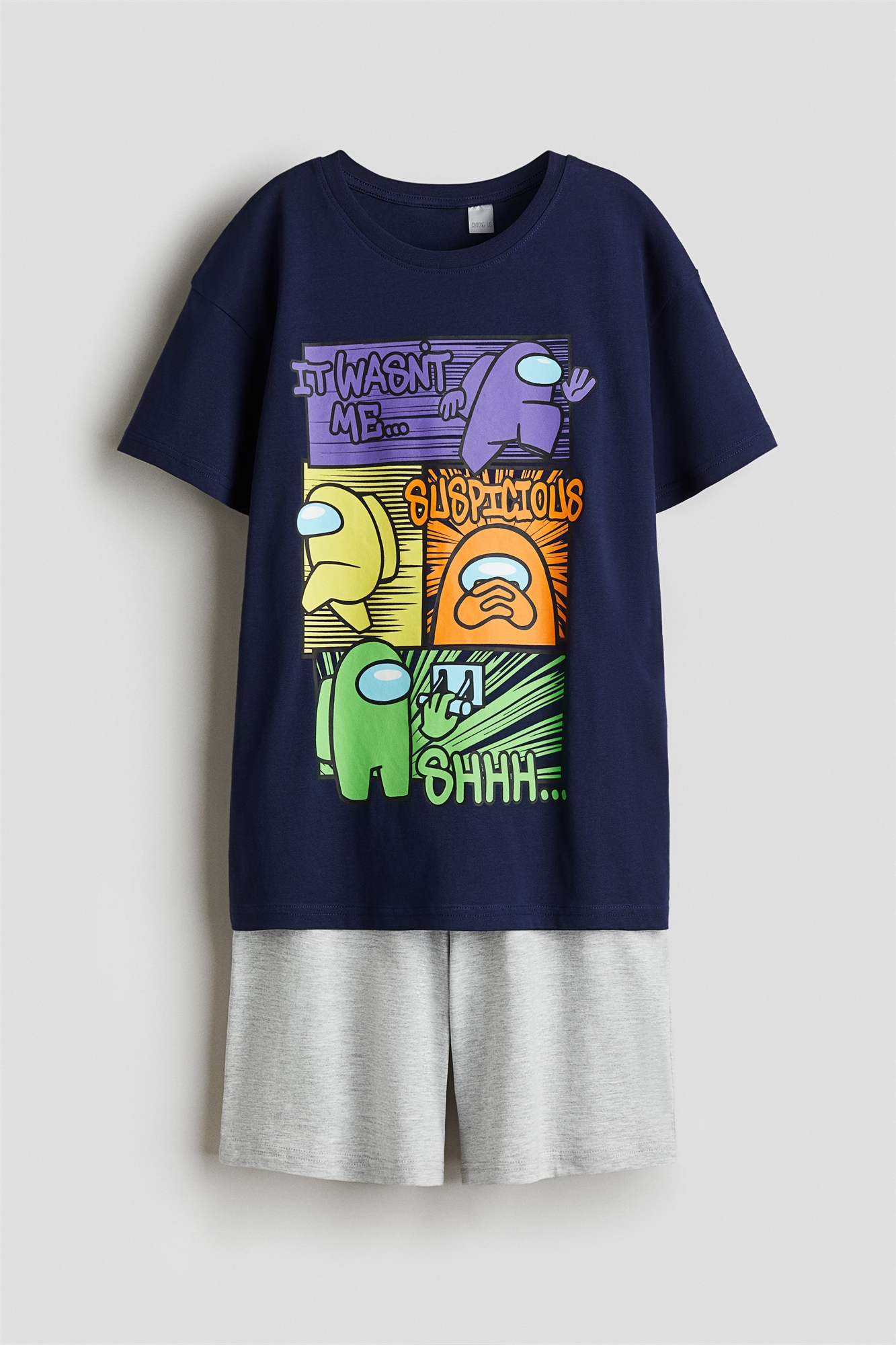 Пижама из мягкого трикотажа с рисунком. Футболка с круглым вырезом с ребристой отделкой и спущенными плечами. Шорты длиной до колена с эластичной талией.