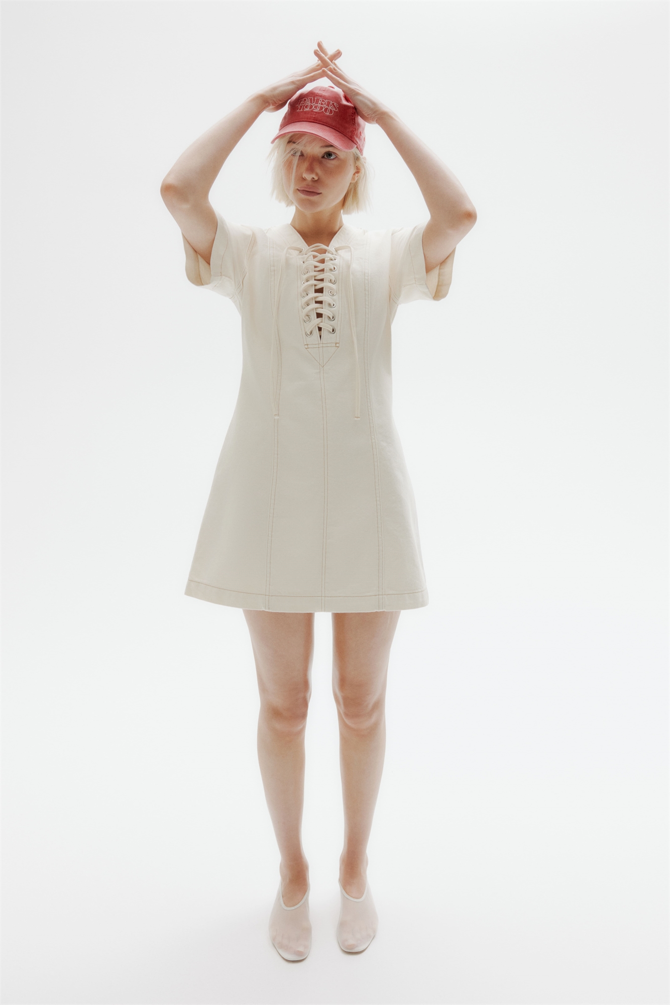 Короткое платье из жесткого хлопкового денима с глубоким V-образным вырезом и шнуровкой спереди. Короткие рукава, застежка-молния сзади и видимые швы спереди и сзади. Без подкладки.