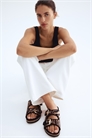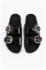 Сандалии с регулируемыми ремешками с металлической пряжкой, формованной стелькой и узорчатой подошвой.