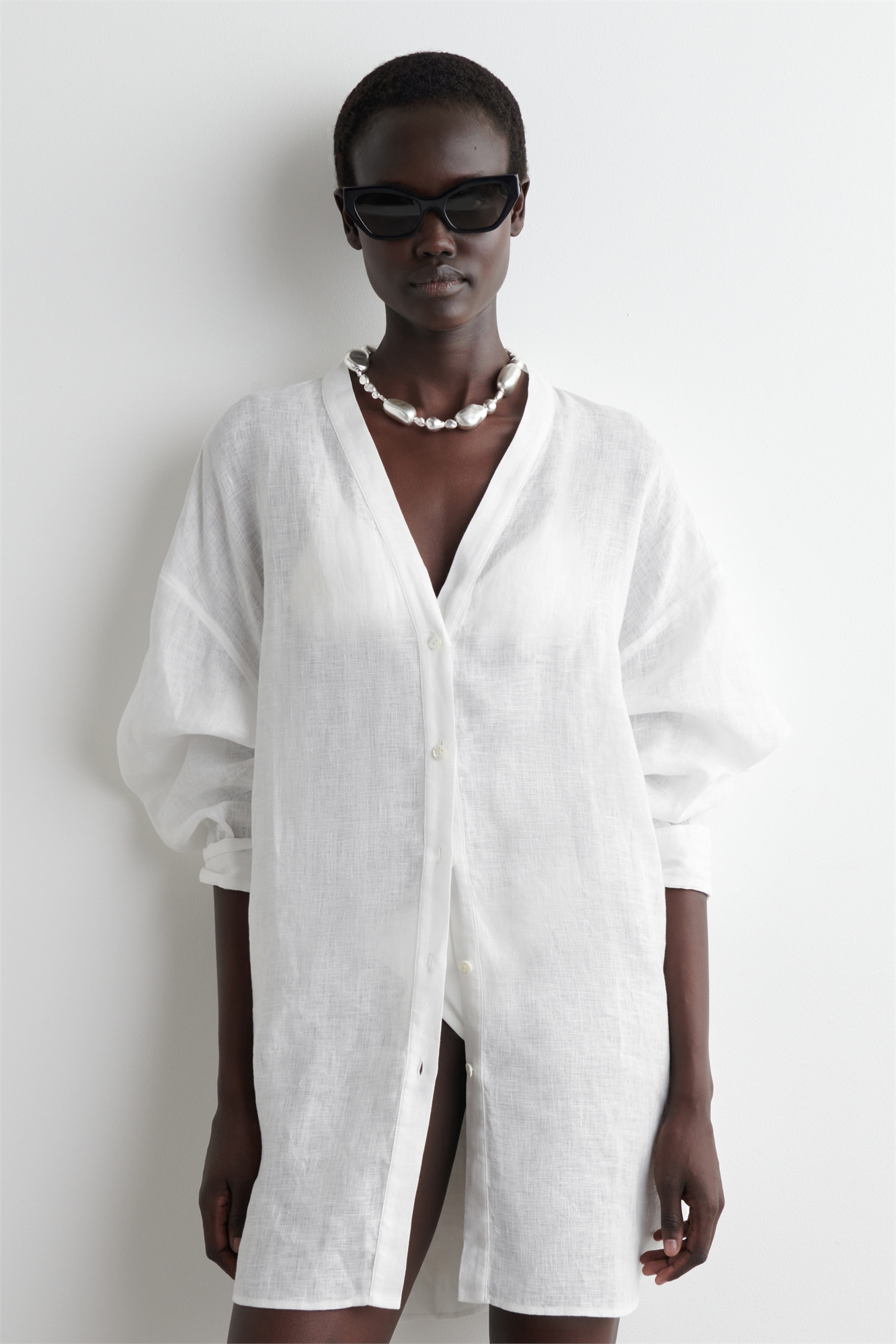 Эта льняная рубашка, созданная с учетом пожеланий местных жителей, отличается своей прозрачностью, что делает ее идеальным вариантом для ношения после купания. Она выполнена в непринужденном стиле оверсайз, имеет V-образный вырез и тональные пуговицы. Свободный крой Застежка на пуговицы Материал: 100% лен. Без учета отделки / Машинная стирка Длина по спинке для размера XS/S составляет 86,3 см. Модель носит размер XS/S