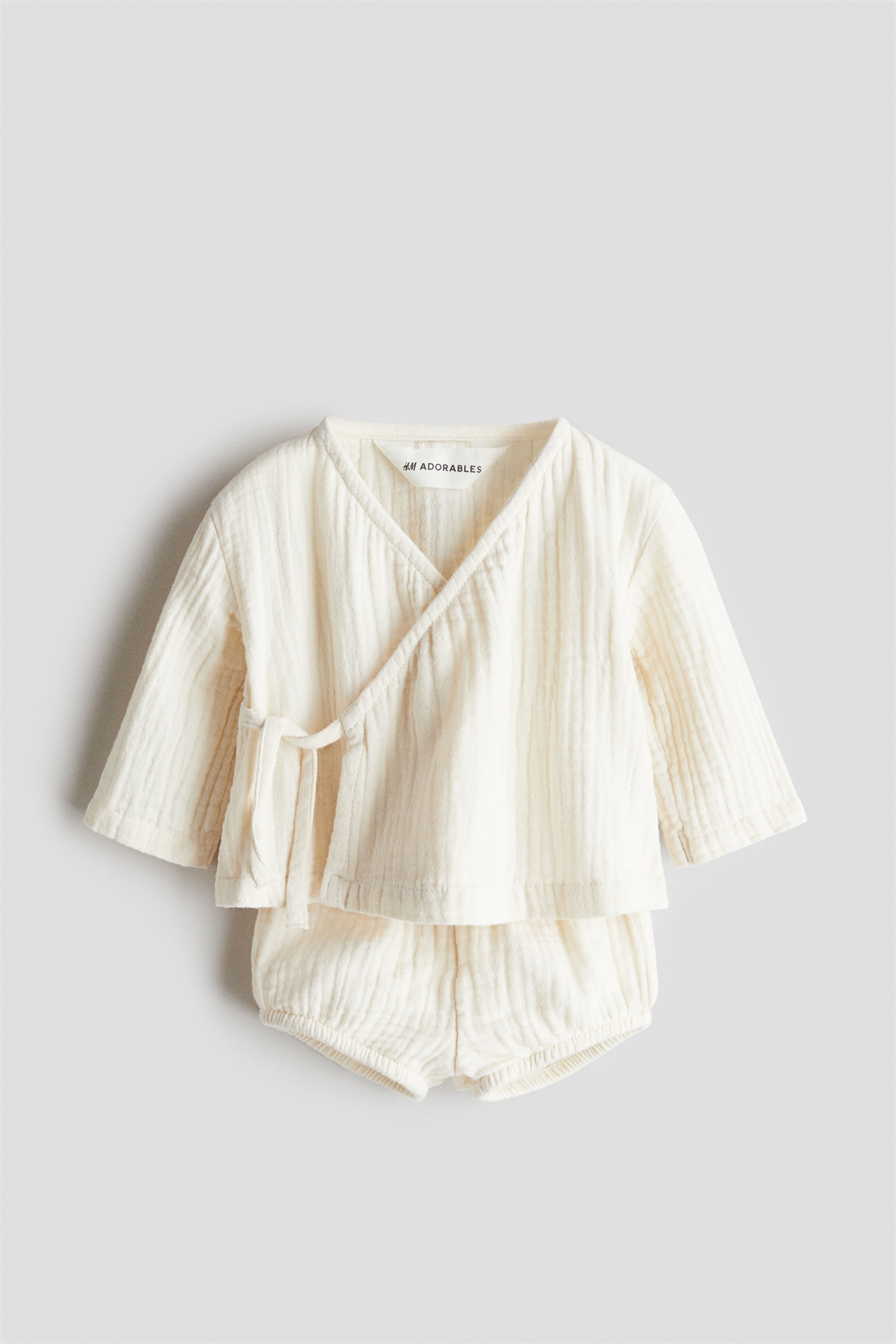H&M Adorables. Комплект из топа и трусиков-распашонок из мягкого муслина, изготовленного из высококачественного хлопка. Топ с длинными рукавами и облегающим передом с завязками с одной стороны и потайной застежкой на кнопки с другой. Плавки с мягкой эластичной резинкой на талии и по ногам. Коллекция H&M Adorables - это подборка удобных и качественных вещей, не теряющих актуальности.