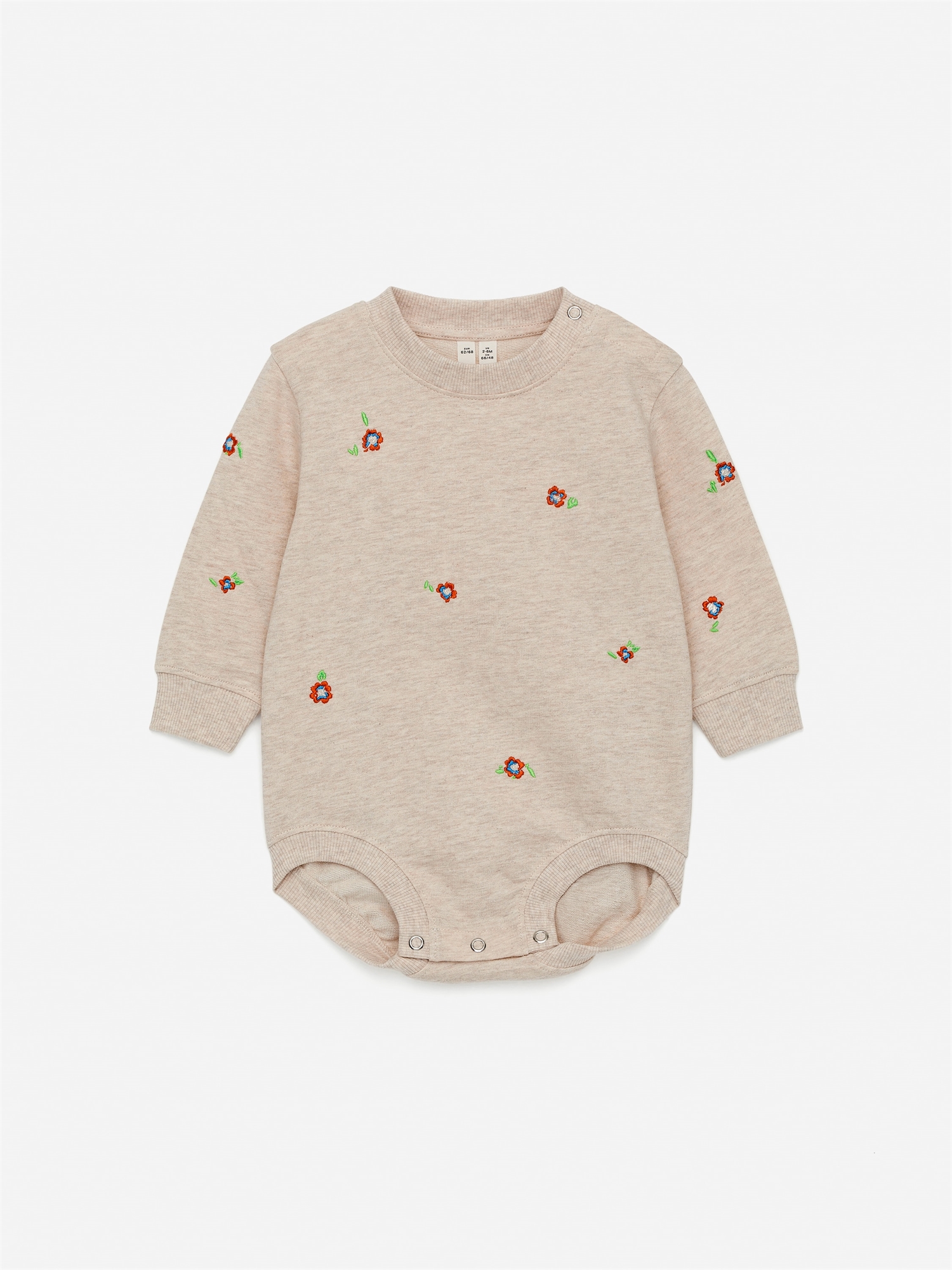 Толстовка-ромпер с вышитыми деталями. Скрытые пуговицы на одном плече для удобства одевания. Ребристая отделка. Свободный крой.