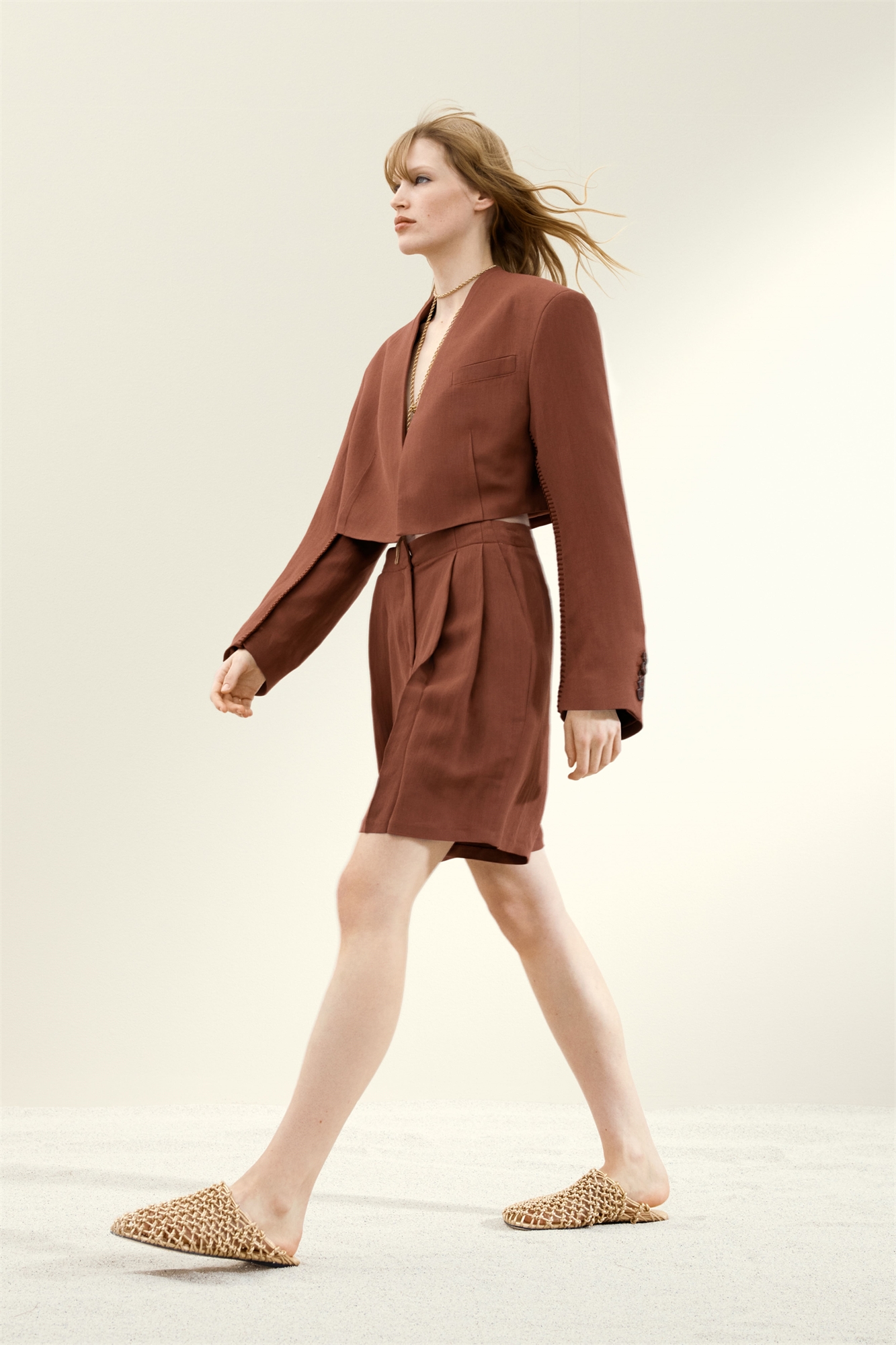 Studio Collection. Шорты длиной до колена из фактурного льна и вискозы. Модель с высокой талией, складками спереди и ширинкой на молнии с потайной застежкой на пуговицу и крючок. Диагональные боковые карманы и втачные задние карманы. Тонкая строчка тон в тон по задней части ног.