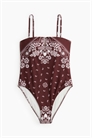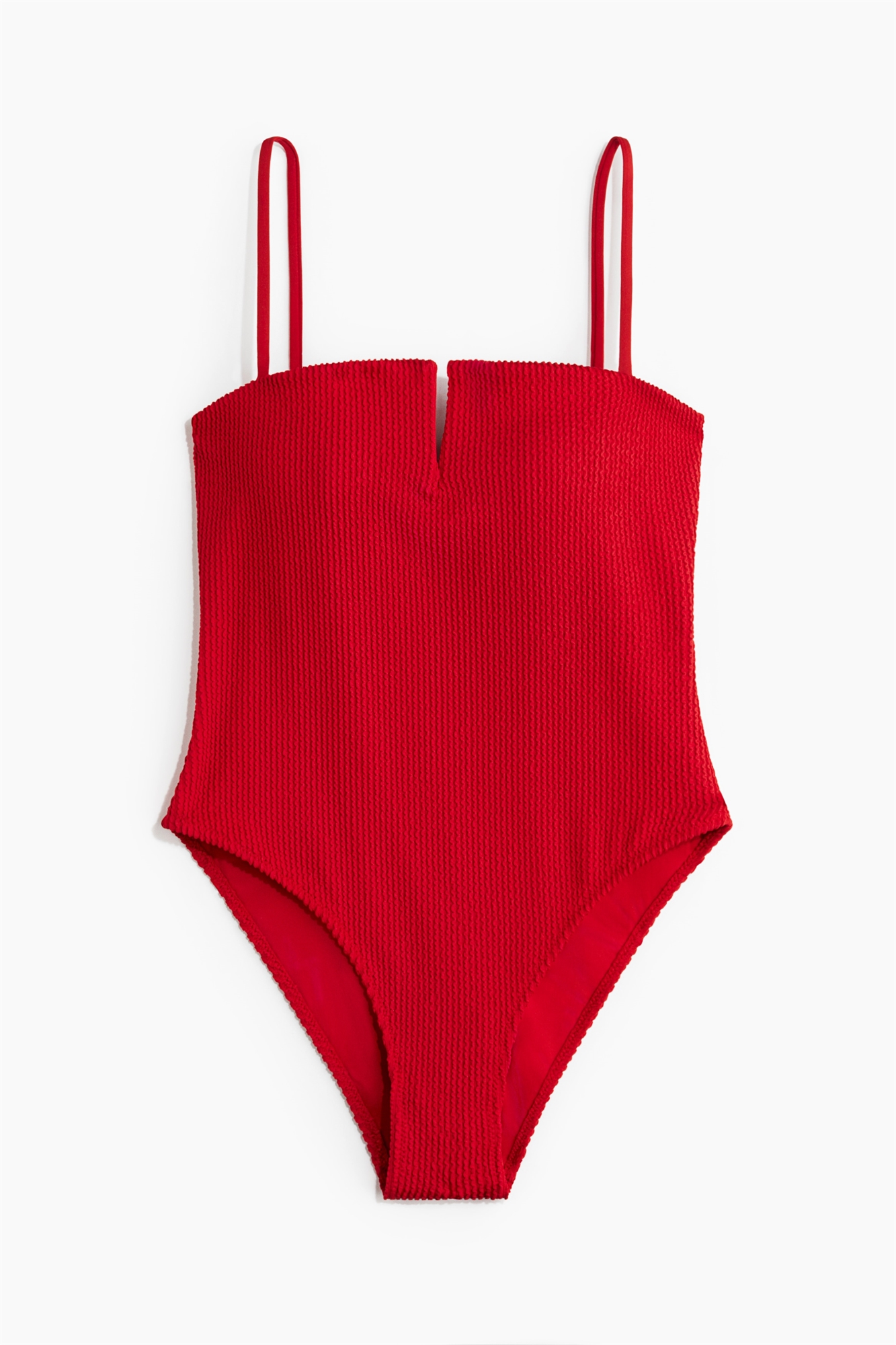 Полностью закрытый купальник с регулируемыми бретелями и чашечками со съемными вкладышами, придающими форму бюсту и обеспечивающими хорошую поддержку. Прямой вырез с V-образным вырезом по центру бюста. Ноги с высоким вырезом и вырезом сзади.
