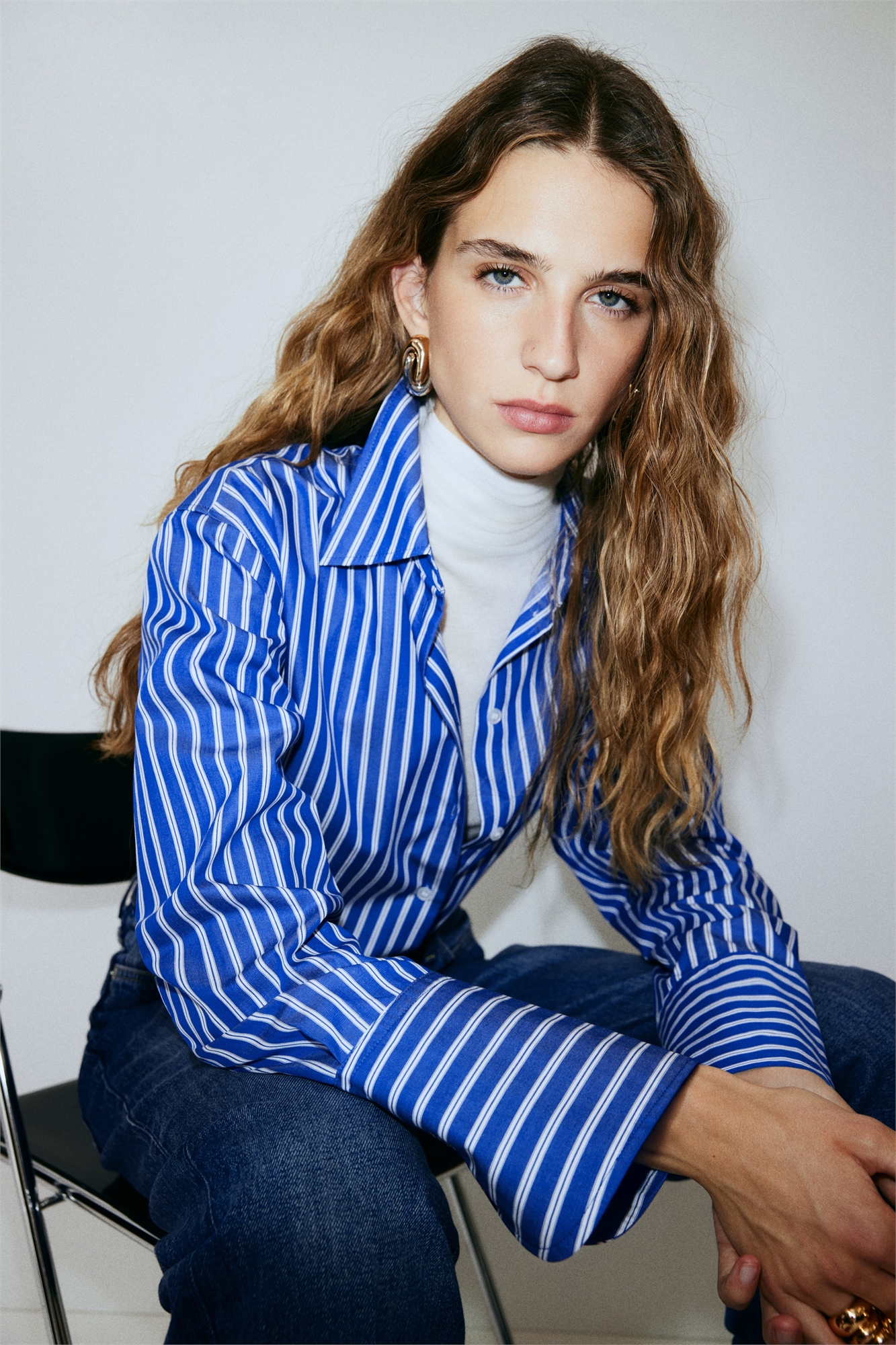 Рубашка оверсайз из хрустящего хлопкового поплина с воротником и пуговицами спереди. Длинные рукава с широкими манжетами на пуговицах и рукавной планкой с пуговицей. Закругленный подол.