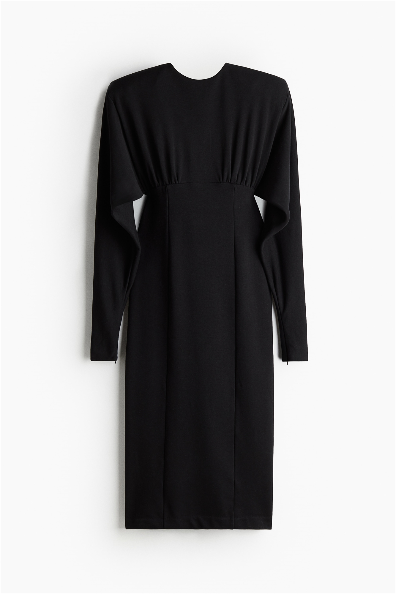 Коллекция Studio. Платье длиной до щиколоток из легкой ткани свитшот со свободным лифом и приталенной юбкой. Круглый вырез и потайная застежка на молнию и крючок-глаз сзади. Накладки на плечах, длинные объемные рукава-баллоны и облегающие манжеты с потайной застежкой-молнией. Присборенный шов над талией, создающий красивую драпировку в верхней части. Частично на подкладке.