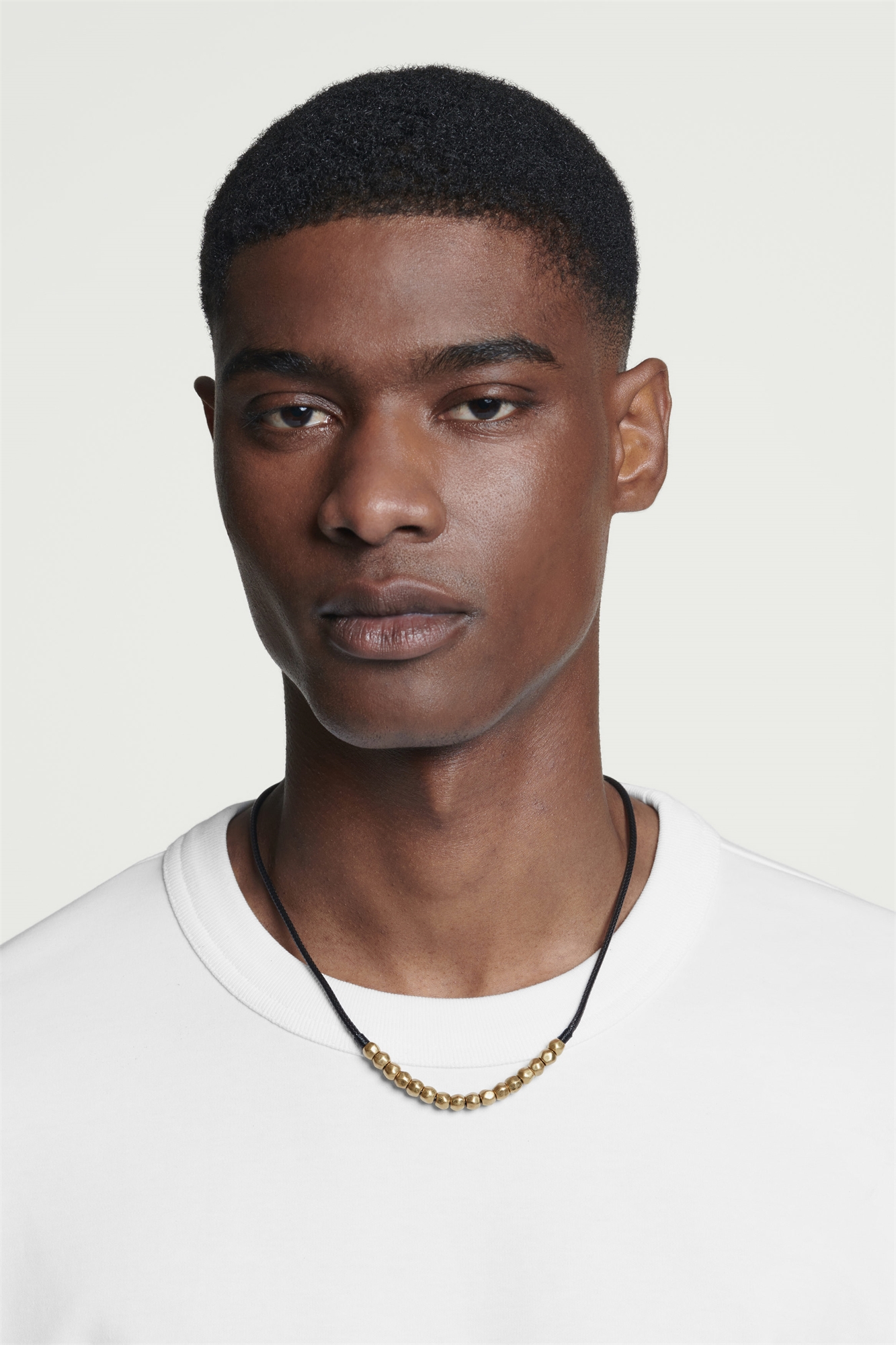 Это современное ожерелье из шнура придаст индивидуальности даже самым простым нарядам. На плетеную веревку нанизан ряд золотистых бусин, которые отшлифованы и обработаны молотком для создания непринужденного образа. Раздвижная застежка Латунь - универсальный материал, который можно перерабатывать множество раз, не теряя при этом своих свойств Оболочка: 92% цинка, 5% латуни, 3% полиэстера вторичной переработки. Без учета отделки