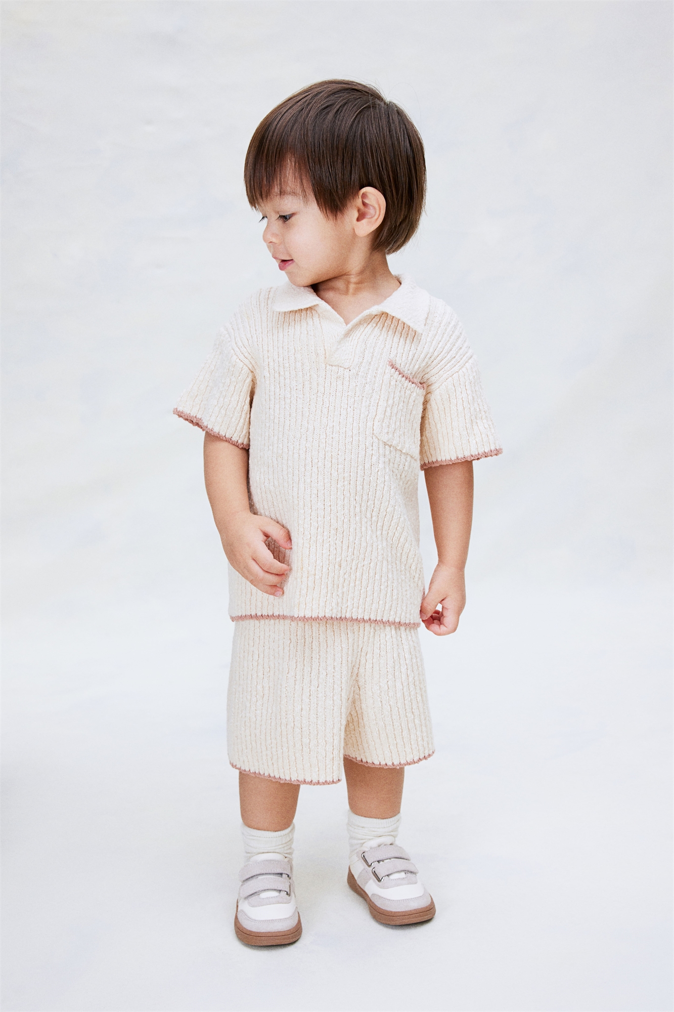 H&M Adorables. Комплект из топа и шорт из мягкого трикотажа букле, изготовленного из высококачественного хлопка. Топ с короткими рукавами, воротником, V-образной проймой в верхней части и открытым нагрудным карманом. Шорты с эластичной утягивающейся талией. Коллекция H&M Adorables - это подборка удобных и качественных вещей, не теряющих актуальности.
