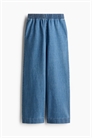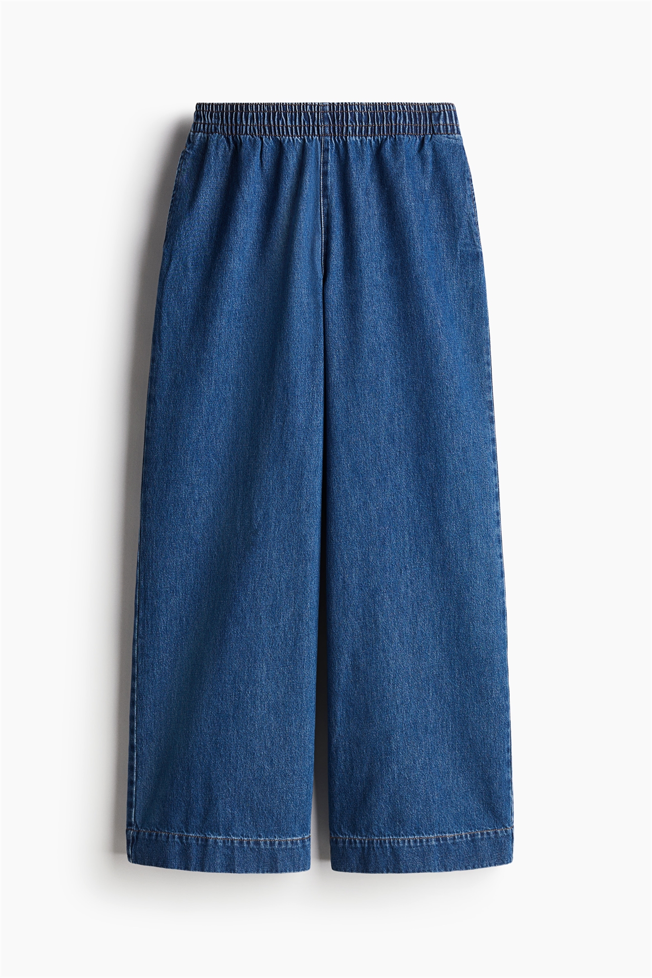 Свободные брюки из хлопкового денима с эластичным швом на талии. Небрежные боковые карманы, декоративные карманы сзади и широкие штанины.