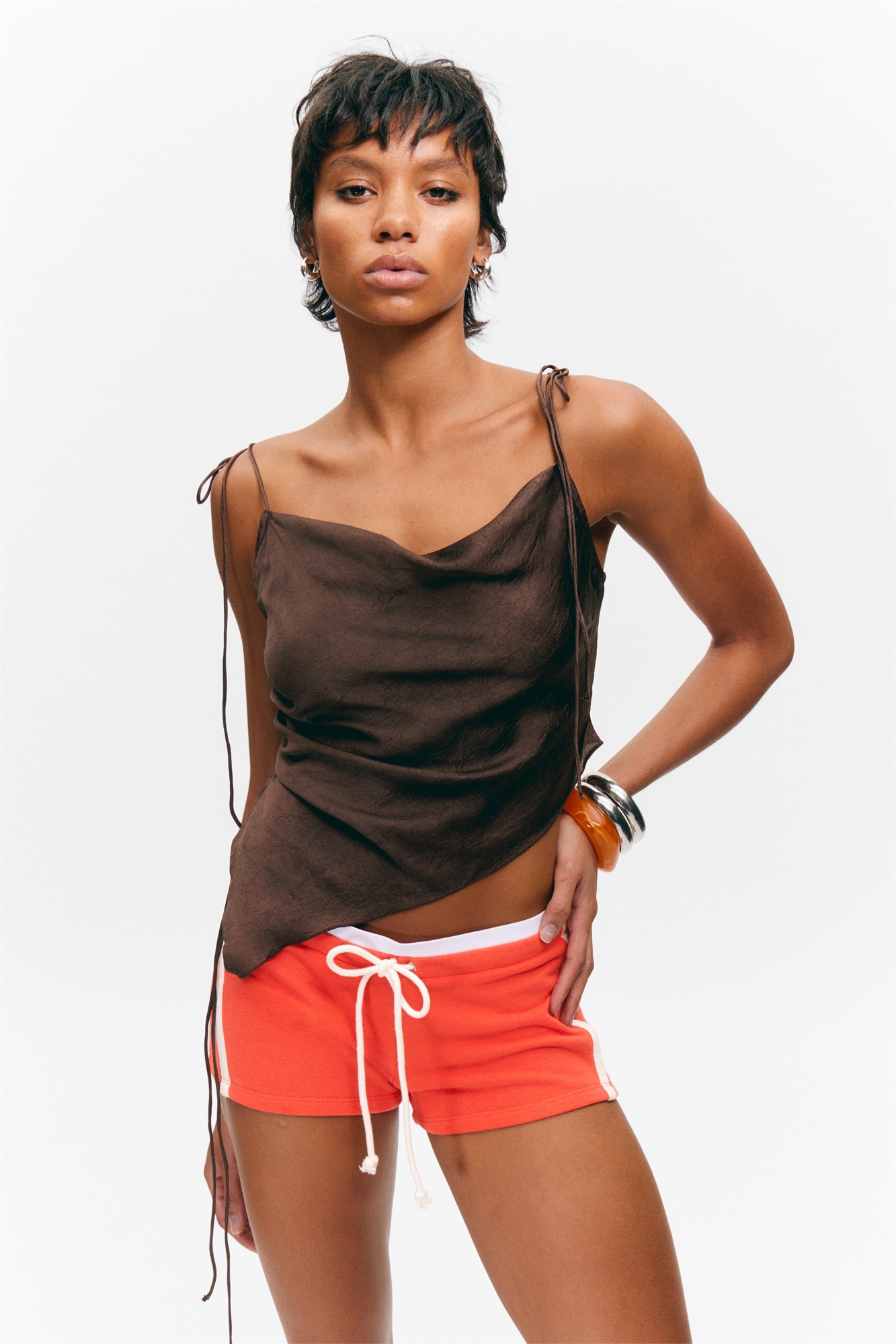 Облегающий топ из мягкого атласа с тонкой текстурой. Вырез-лодочка, регулируемые бретели-спагетти и асимметричный подол. Сбоку имеется завязка для придания драпировки, а застежка на молнии обеспечивает надежную фиксацию.