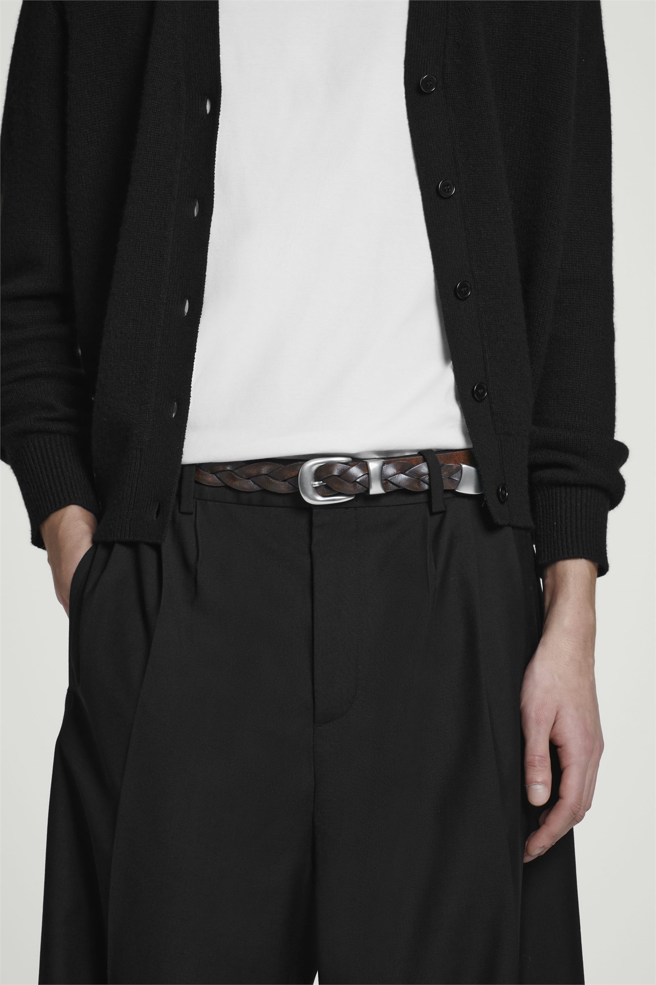Этот плетеный ремень, сплетенный из нитей эластичной кожи, имеет нестареющий каштановый оттенок, который дополнит большинство вещей в вашем гардеробе. Ремень оснащен металлическим наконечником серебряного цвета и пряжкой, которая регулируется. Застежка на пряжке COS поддерживает ответственное производство через Leather Working Group Материал: 100% кожа. За исключением отделки