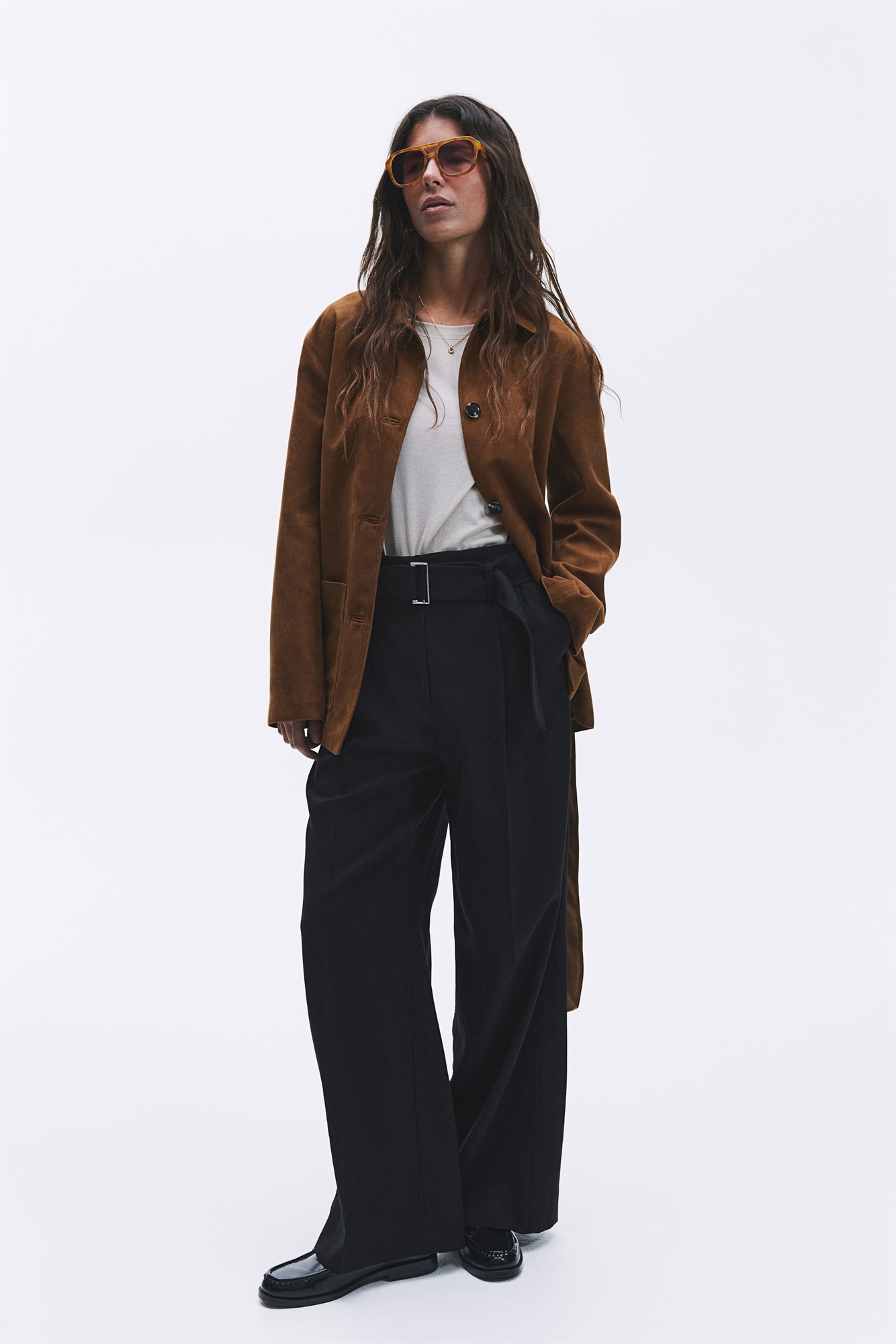 Приталенные брюки свободного кроя из тканого материала с высокой талией из бумажного мешка и съемным поясом с металлической пряжкой. Ширинка на молнии с потайной застежкой на крючок и планку, диагональные боковые карманы и втачные карманы сзади. Широкие ноги со складками спереди и складками спереди и сзади.