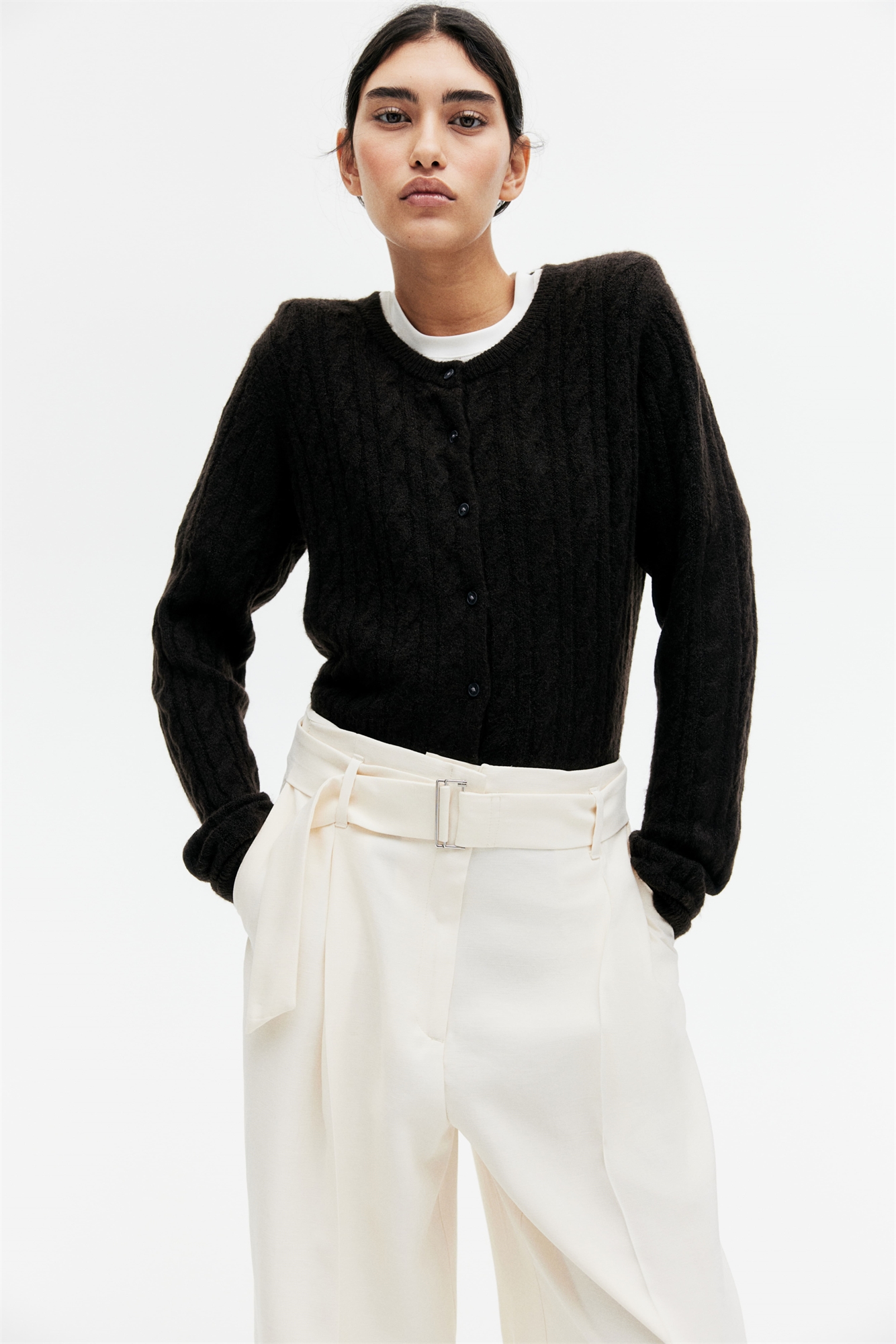 Приталенные брюки свободного кроя из тканого материала с высокой талией из бумажного мешка и съемным поясом с металлической пряжкой. Ширинка на молнии с потайной застежкой на крючок и планку, диагональные боковые карманы и втачные карманы сзади. Широкие ноги со складками спереди и складками спереди и сзади.