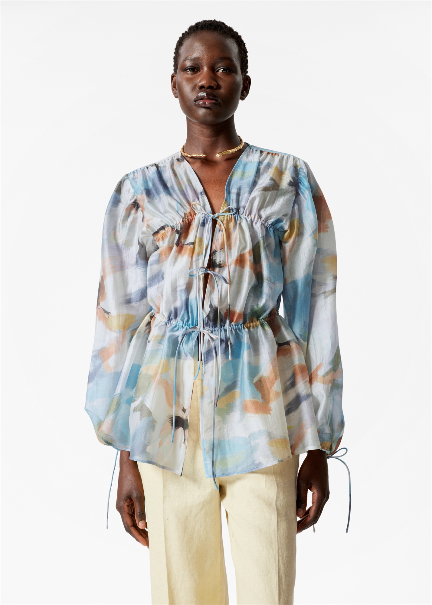 Блузка из легкой ткани. Она имеет пышный силуэт с V-образным вырезом и нежными завязками спереди, создающими эффект собранности. Длинные объемные рукава с регулируемыми завязками на манжетах обеспечивают индивидуальную посадку. Длина блузки: 69 см / 27,5" (размер S)