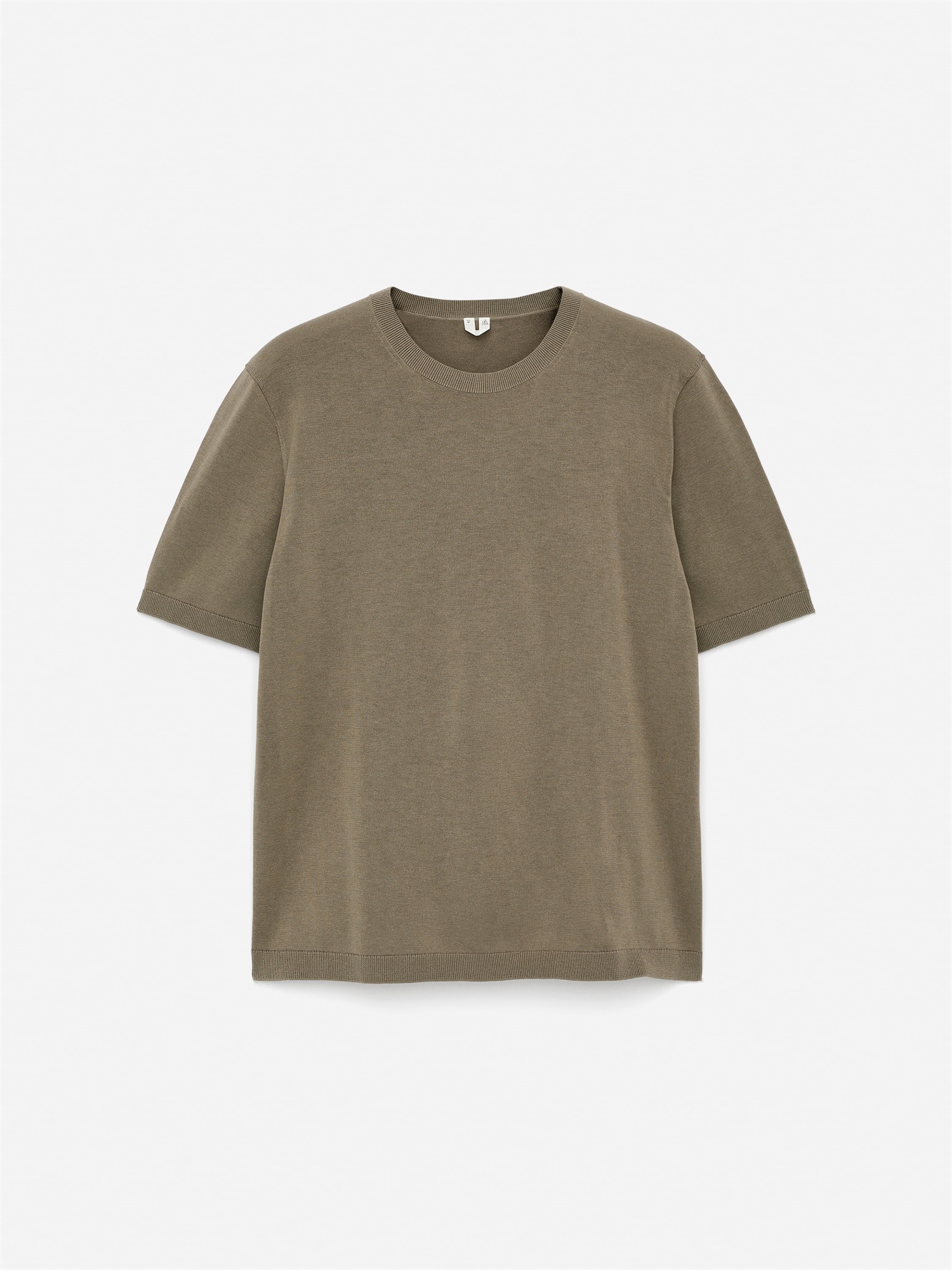 Футболка из тонкого трикотажного хлопка. Модель с вырезом горловины и обычным кроем.