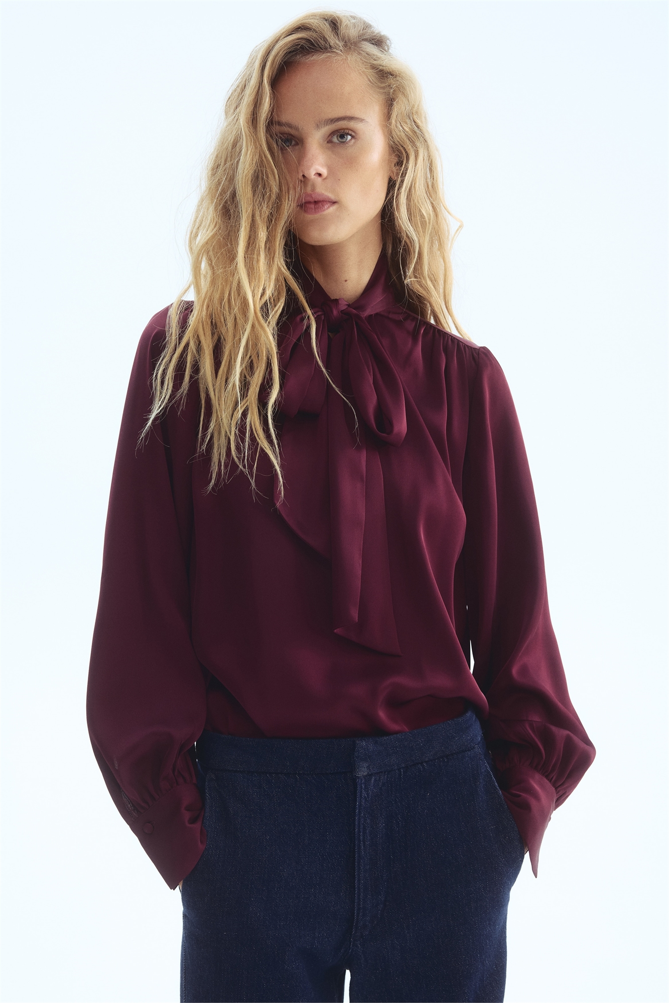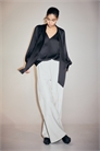 Блузка из тонкого шифона с воротником-бантом и V-образной проймой спереди. Сборки на плечах и длинные рукава-баллоны с манжетами на пуговицах. Без подкладки.