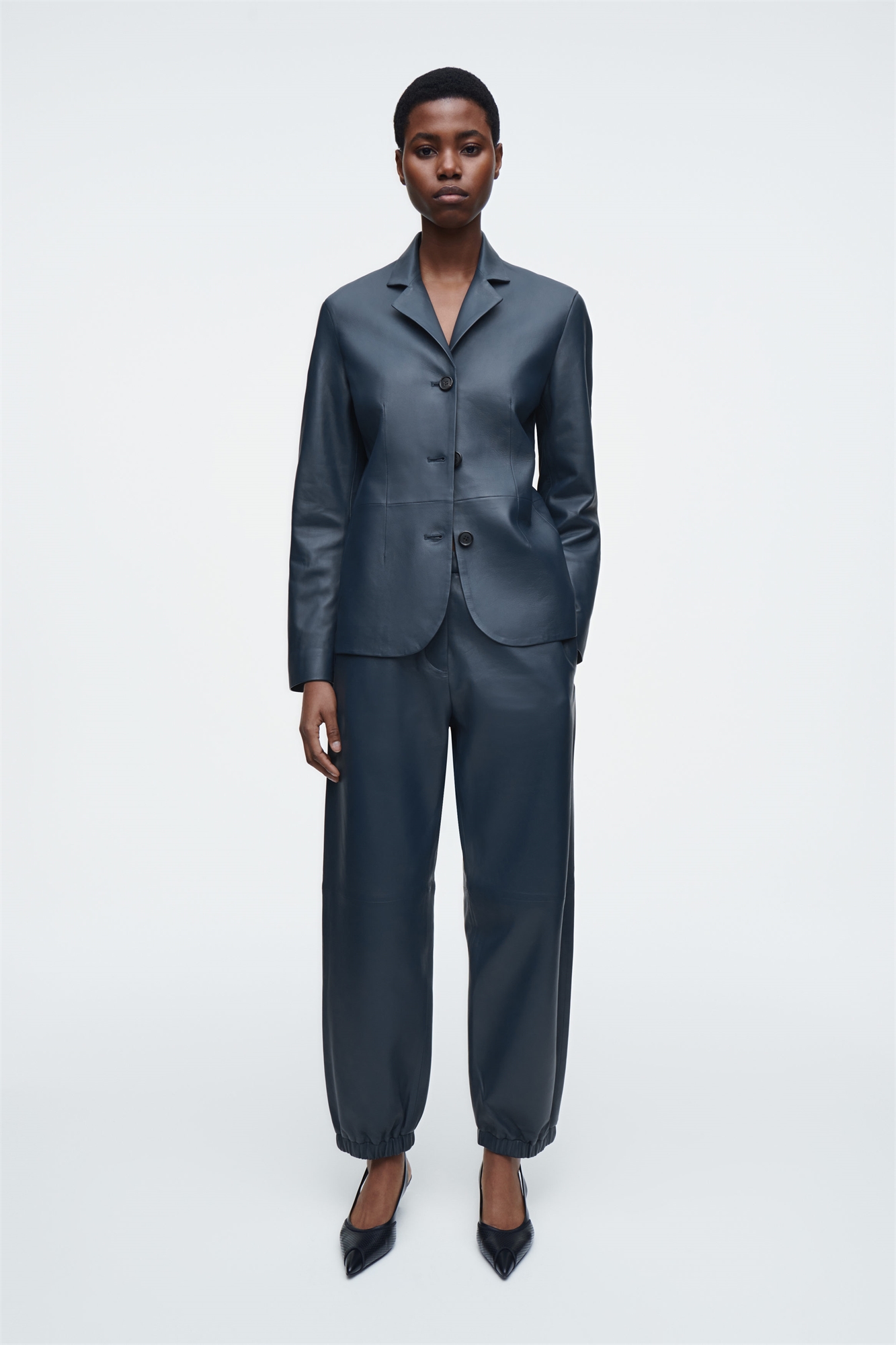 Эти утонченные джоггеры из мягкой кожи насыщенного полуночно-темного оттенка выполнены в изысканном стиле. Они выполнены в классическом прямом силуэте с эластичным поясом и манжетами. Для создания однотонного образа сочетайте их с блейзером. Свободный крой Застежка на пуговицах и молнии COS поддерживает ответственное производство через Leather Working Group Материал: 100% кожа. Подкладка: 100% вискоза. Без учета отделки / Чистка специалистом Внутренняя длина ноги размера EU 36 составляет 74,8 см / Модель носит размер EU 36