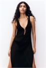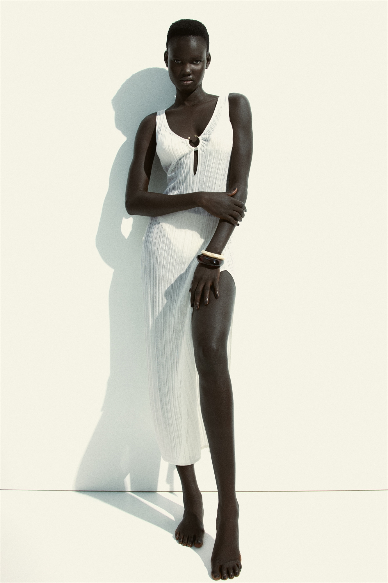 Пляжное платье без рукавов длиной до щиколоток из трикотажной вискозной смеси с глубоким V-образным вырезом и отверстием для ключа с металлическим кольцом спереди. Прямой подол с высоким разрезом с каждой стороны.