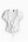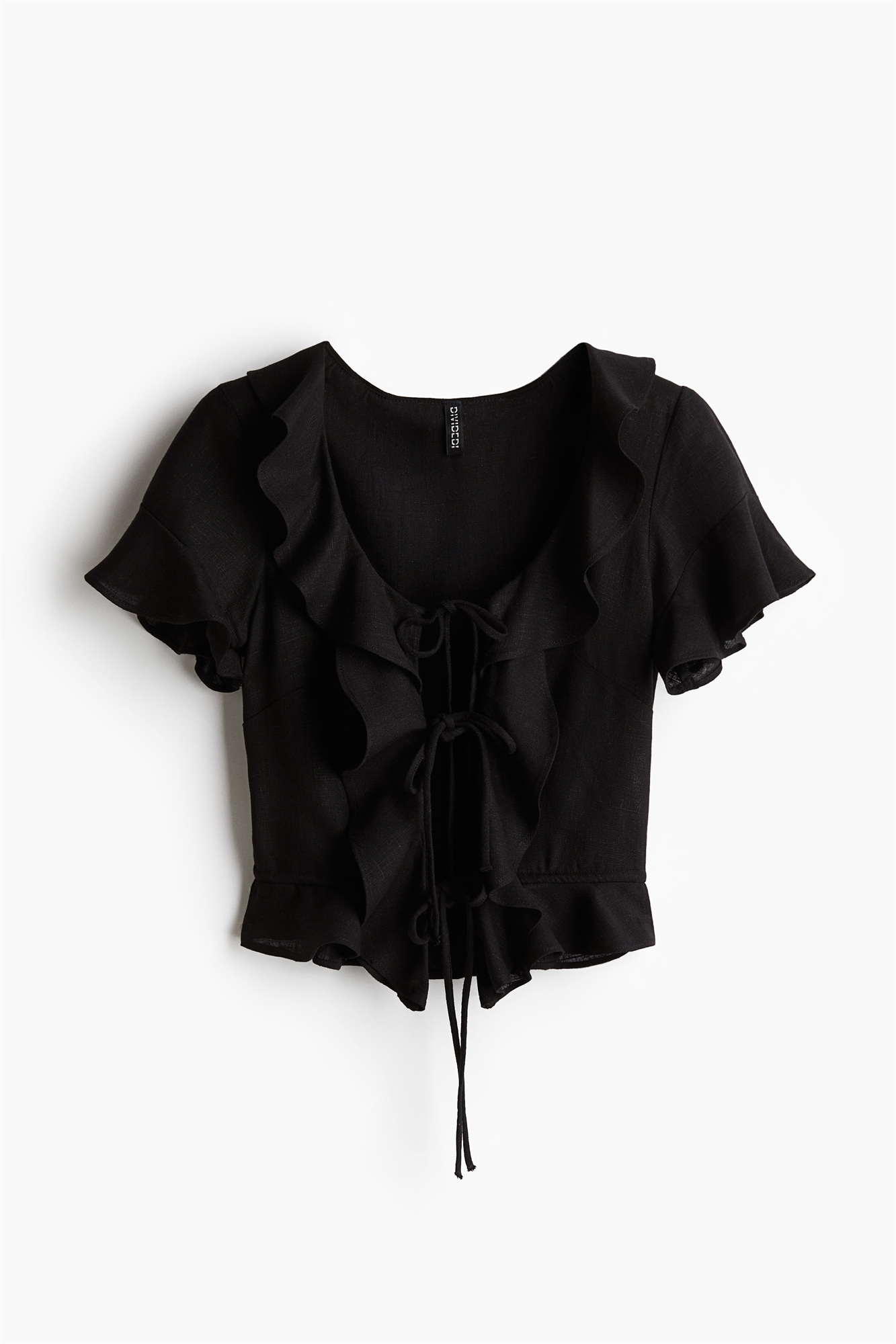 Короткая приталенная блузка из смеси льна и вискозы с воздушным переплетением. Глубокий круглый вырез и короткие рукава. Открытая передняя часть с двумя парами узких завязок и шнурком на талии. Широкие воланы по вырезу горловины, пройме, рукавам и подолу.