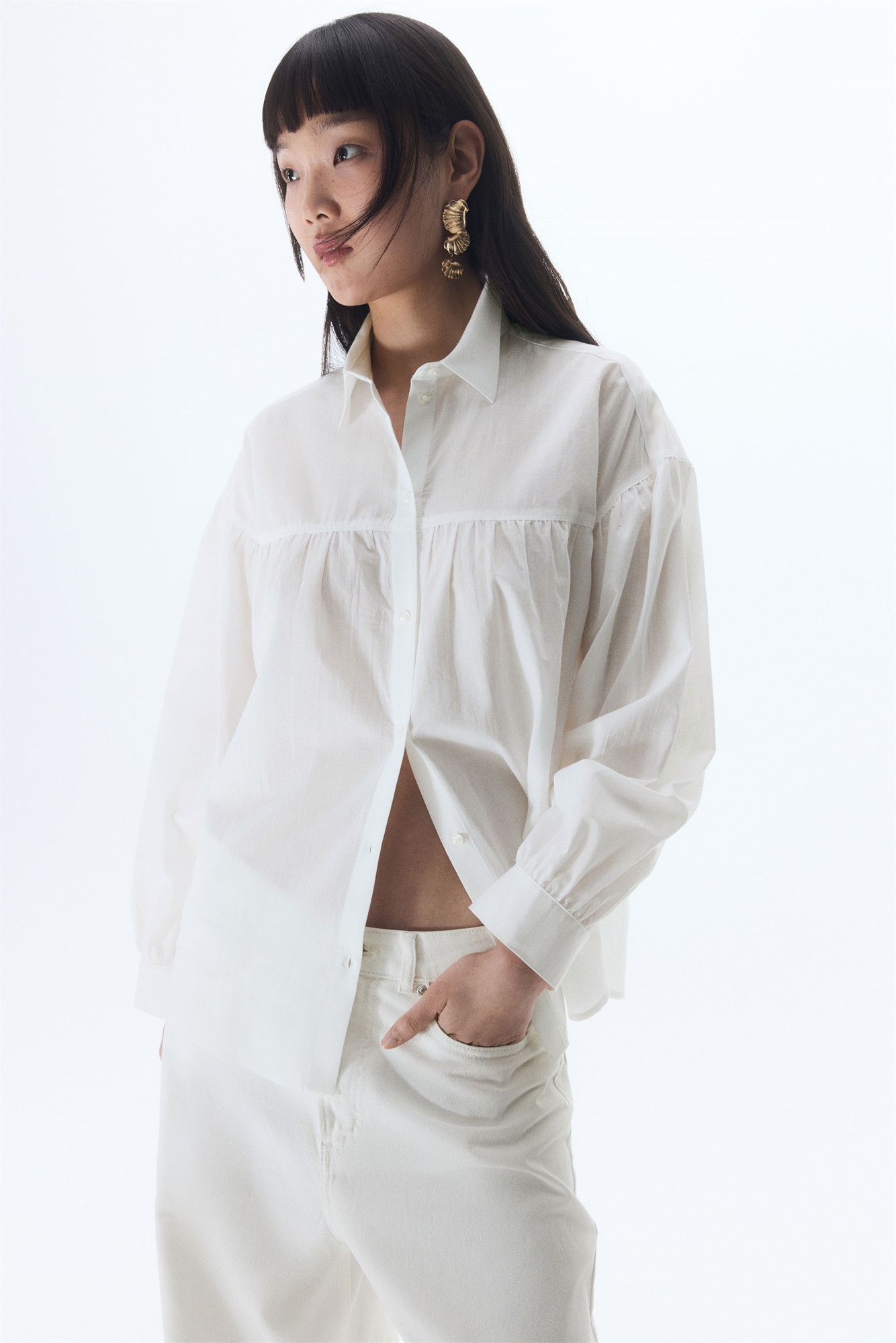 Рубашка оверсайз из воздушного хлопкового полотна с воротником, пуговицами спереди и сборчатым верхом спереди и сзади. Спущенные плечи и длинные рукава с манжетами.