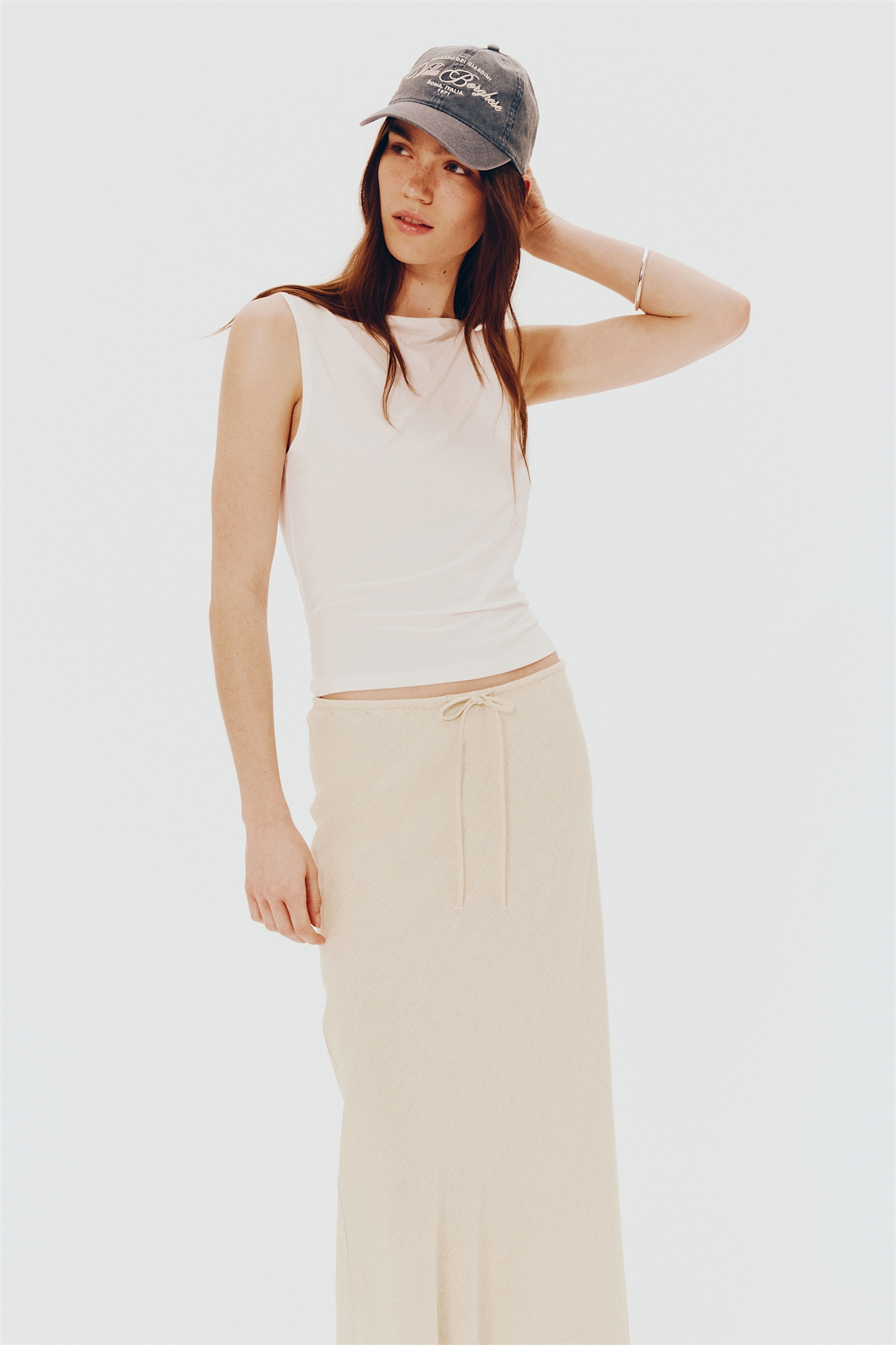 Длинная юбка с воздушным переплетением из смеси вискозы и льна. Эластичный пояс с завязками и прямой подол. Без подкладки.