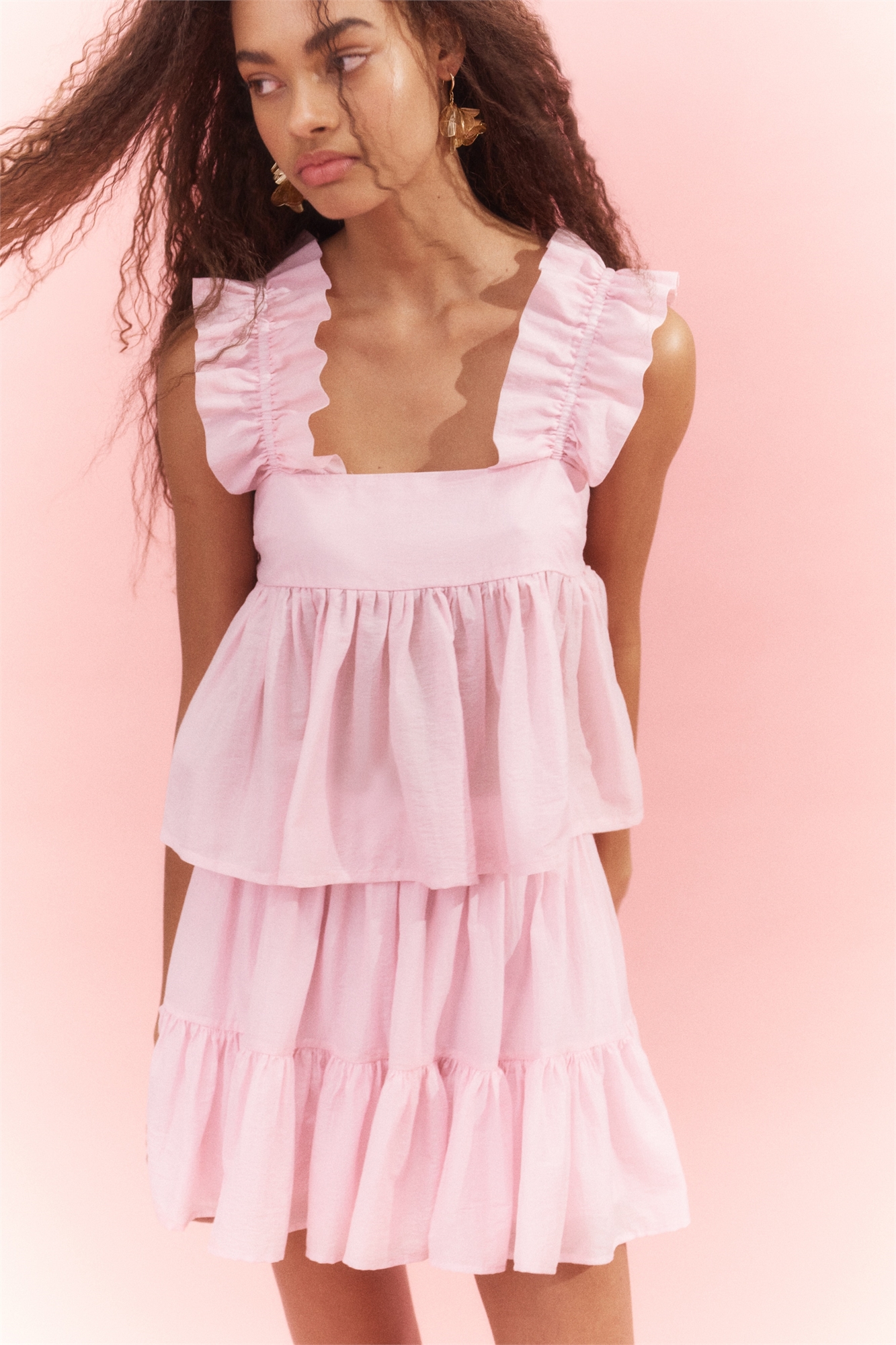 Мини-юбка из тканого материала с эластичной талией и широким воланом по подолу.