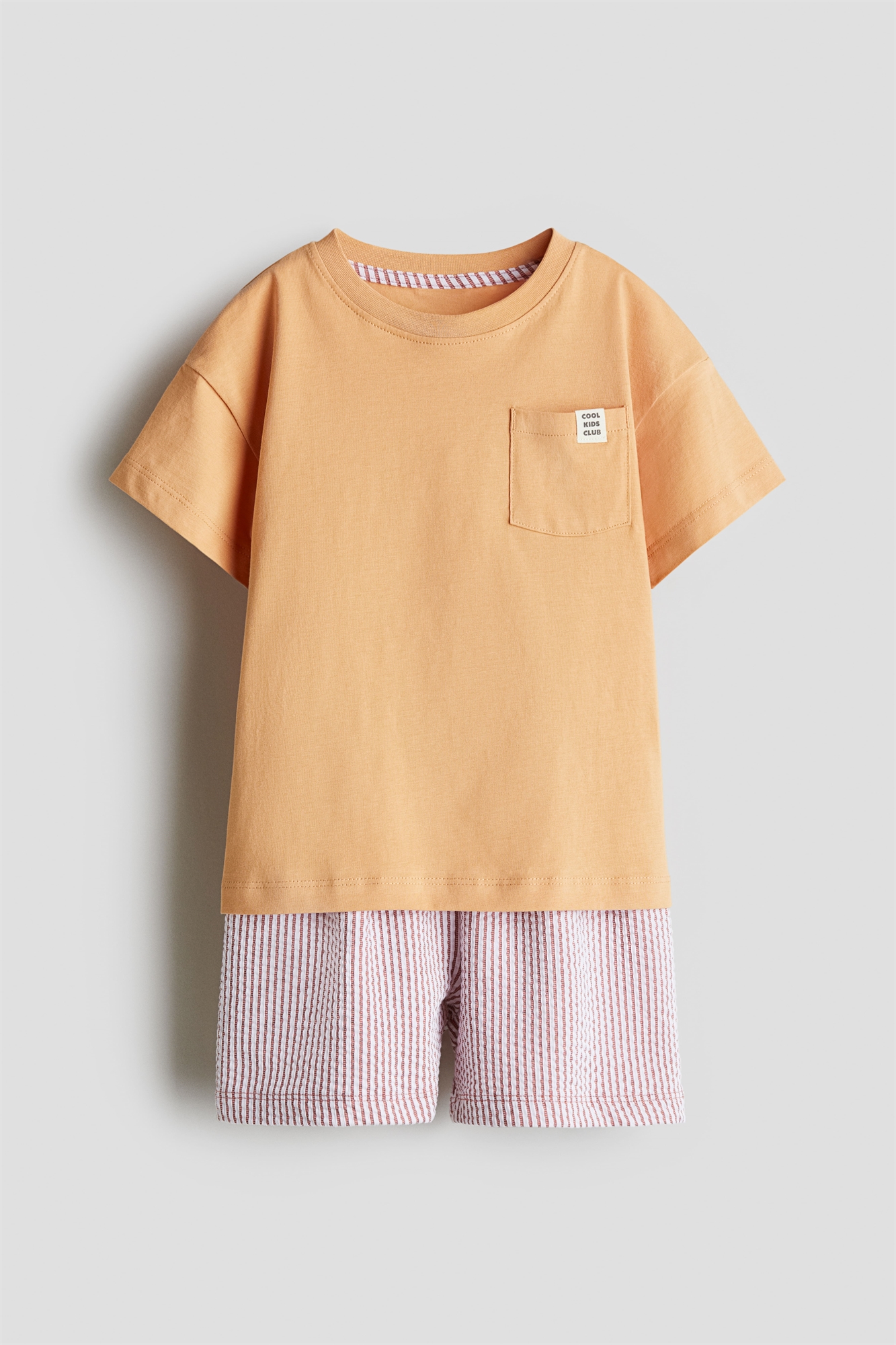 Пижама с футболкой и шортами. Футболка из мягкого хлопкового джерси с круглым вырезом в рубчик и нагрудным карманом. Шорты из трикотажа в стиле "сирсакер" с эластичной резинкой на талии.