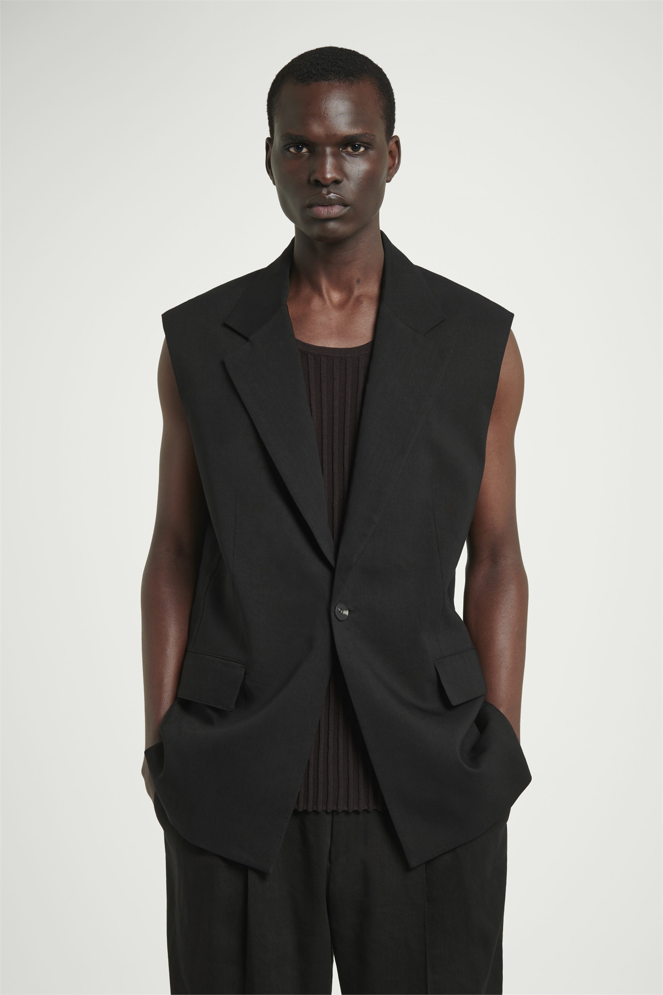 Подиумная коллекция COS SS25 основана на кодексе долговечного дизайна и исключительного мастерства. Этот блейзер без рукавов, выполненный в непринужденной форме, с мягкими плечами, передними карманами с клапанами и петлей для вешалки из гросгрейна - фирменный знак дома. Он изготовлен из богатой текстурой смеси льна и может быть использован в качестве костюма с соответствующими брюками. Свободный кройЗастежка на пуговицахАцетат целлюлозы NAIA™- это полностью отслеживаемое ацетатное волокно, изготовленное из экологически чистой древесной массы с использованием процесса с меньшим воздействием на окружающую среду Оболочка: 50% вискозы, 48% льна, 2% эластана. Подкладка: 100% NAIA™ ацетат целлюлозы. Без учета отделки / Сухая чистка Длина по спинке для размера EU 48 составляет 81,25 см / Модель носит размер EU 48