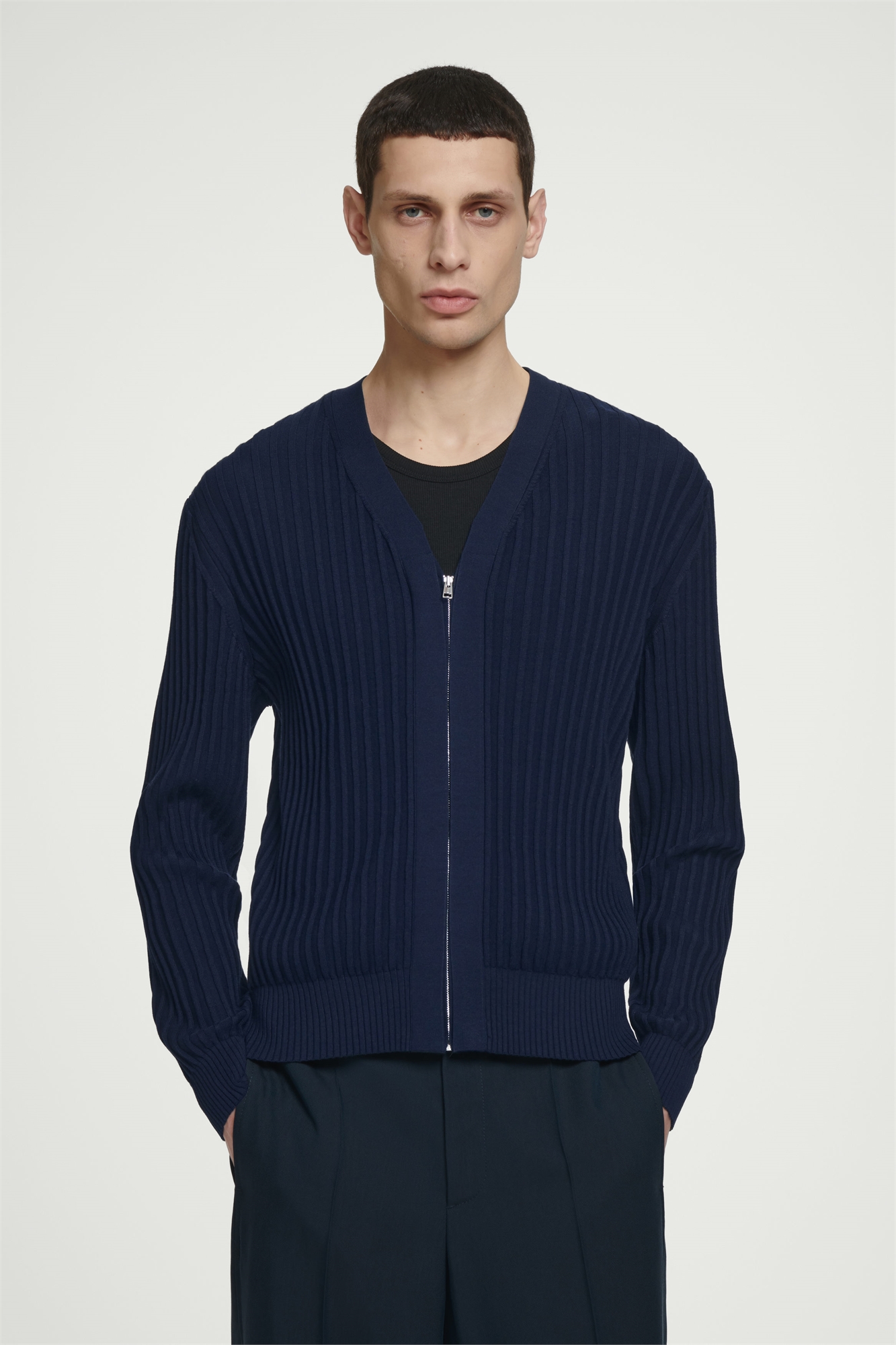 Подиумная коллекция COS SS25 основана на кодексе долговечного дизайна и исключительного мастерства. Этот кардиган насыщенного полуночно-темного цвета изготовлен из смеси блестящего шелка тутового дерева и мягкого хлопка с ребристой отделкой. Кардиган классического покроя с высоким V-образным вырезом и потайной застежкой-молнией серебряного цвета. Regular fitЗастежка-молния Материал: 55% шелк малбери, 45% хлопок. Без учета отделки / Машинная стирка Длина по спинке для размера M составляет 65 см / Модель носит размер M