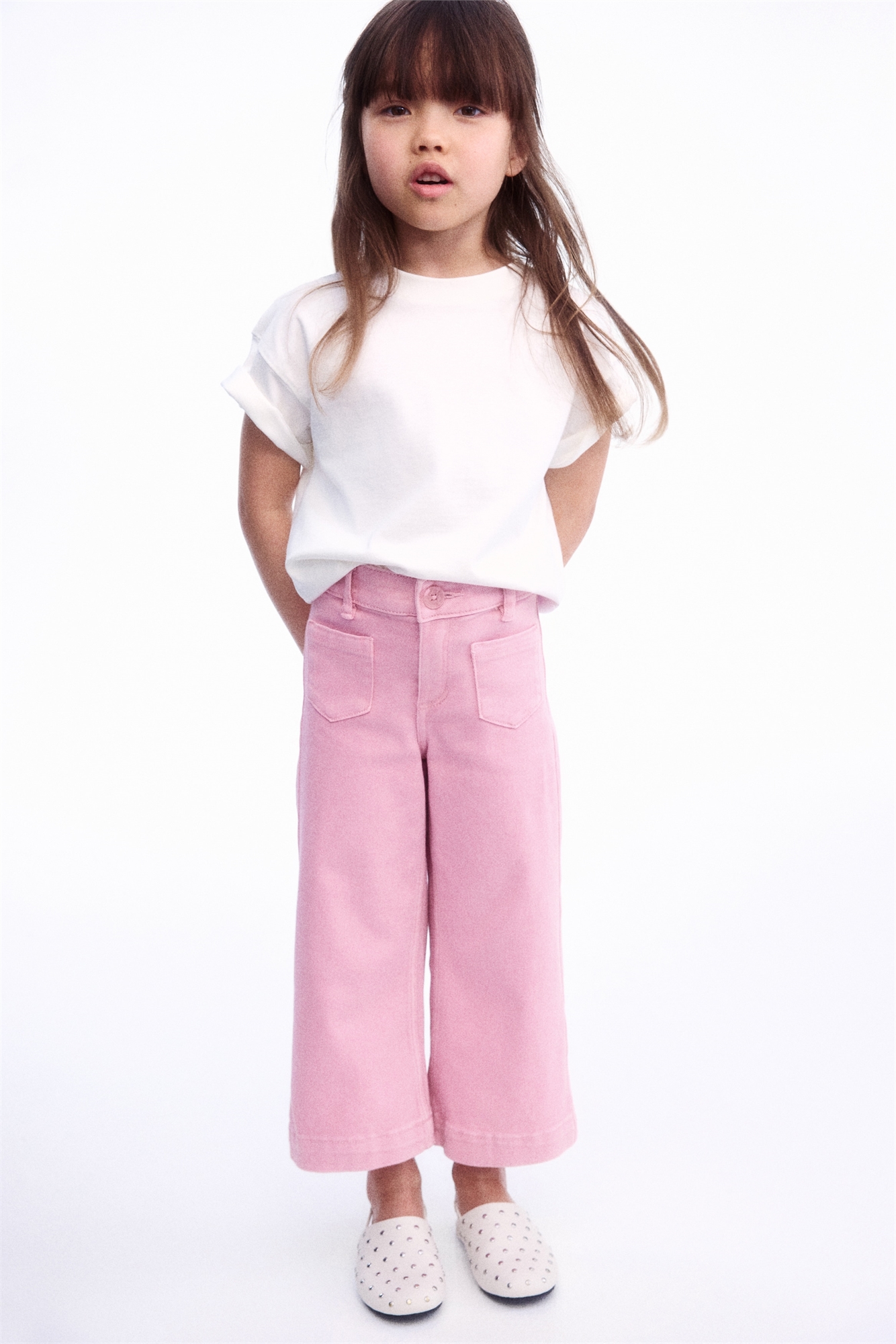 Брюки длиной до щиколоток из эластичной хлопковой саржи с расклешенными ногами. Регулируемая эластичная талия и открытые передние карманы.