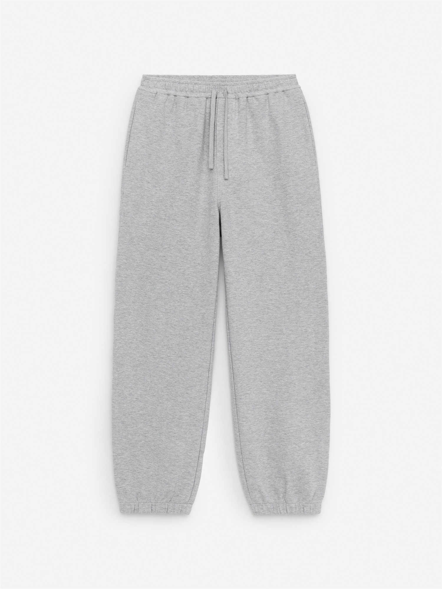 Тренировочные брюки из двойного трикотажного полотна с фактурной поверхностью. Современный силуэт с просторной удобной посадкой, прямой крой и сборки по низу подола. Эластичный пояс с утягивающим шнурком. Карманы в боковых швах и накладной карман сзади. Можно приобрести соответствующую толстовку.