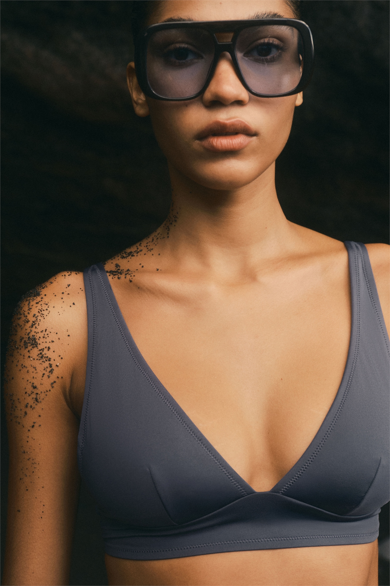 Бикини-треугольник на подкладке с регулируемыми бретелями и чашечками со съемными вставками, которые формируют бюст и обеспечивают хорошую поддержку. Металлическая застежка сзади.
