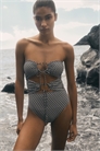 Полностью закрытый купальник-бандо с чашечками со съемными вставками, придающими форму бюсту и обеспечивающими хорошую поддержку. Вырезы спереди и проймы с завязками на морскую тематику. Высокие вырезы на ногах и средняя степень защиты сзади.