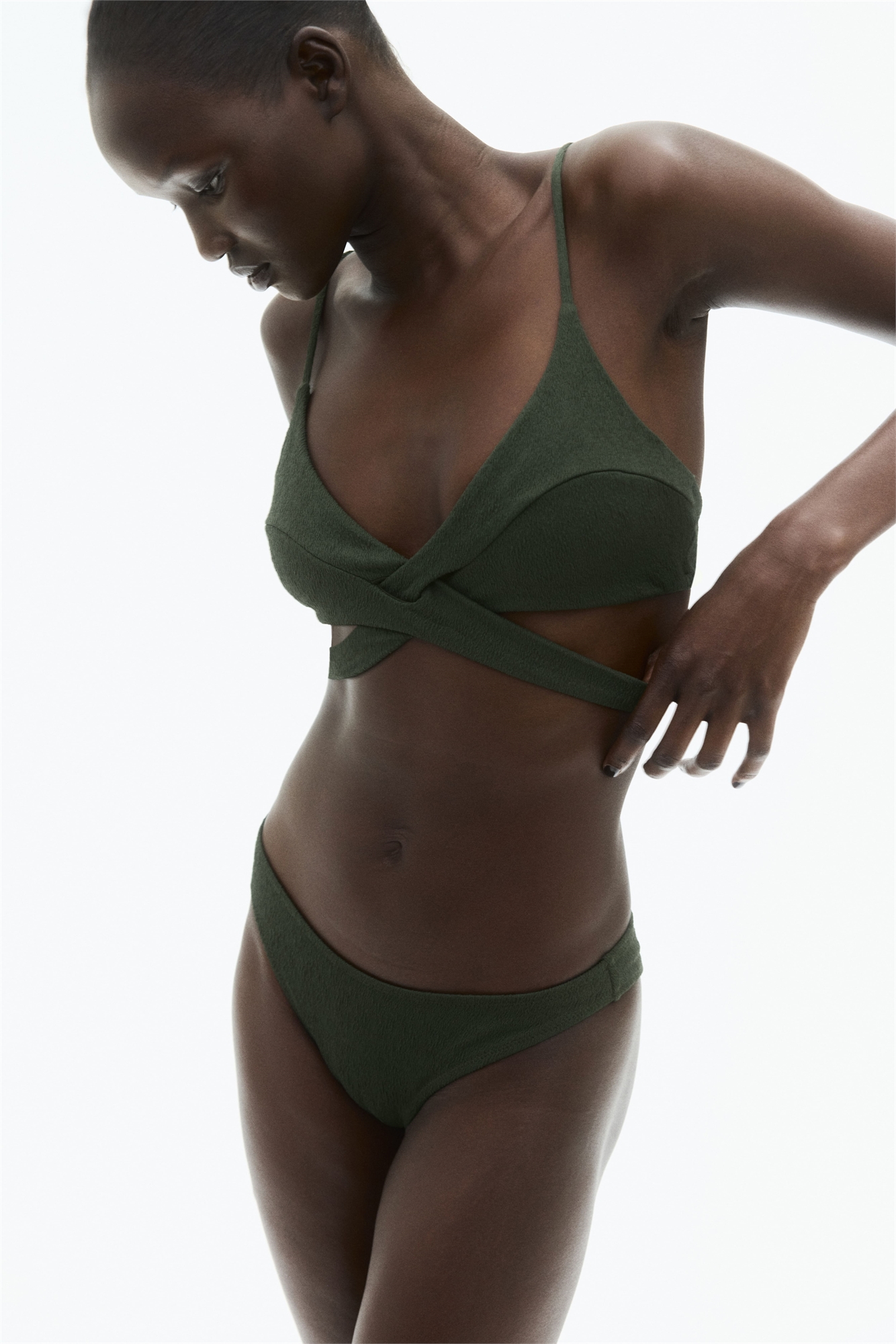 Бикини-треугольник на подкладке с регулируемыми бретелями и чашечками со съемными вставками, придающими форму бюсту и обеспечивающими хорошую поддержку. Облегающая часть спереди с вырезами по бокам и металлической застежкой сзади.