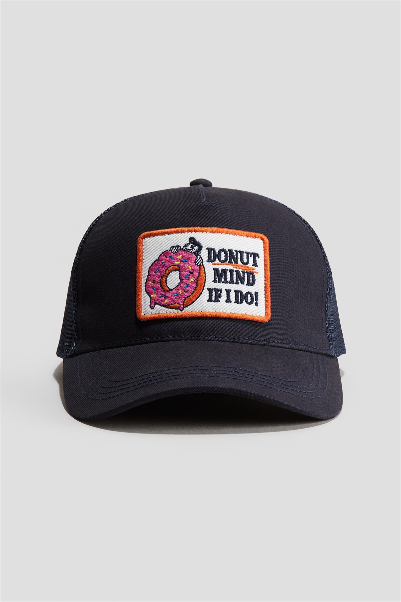 Кепка дальнобойщика из хлопкового денима и сетки с изношенными деталями и аппликацией спереди. Регулируемая пластиковая застежка сзади и хлопковый потник.