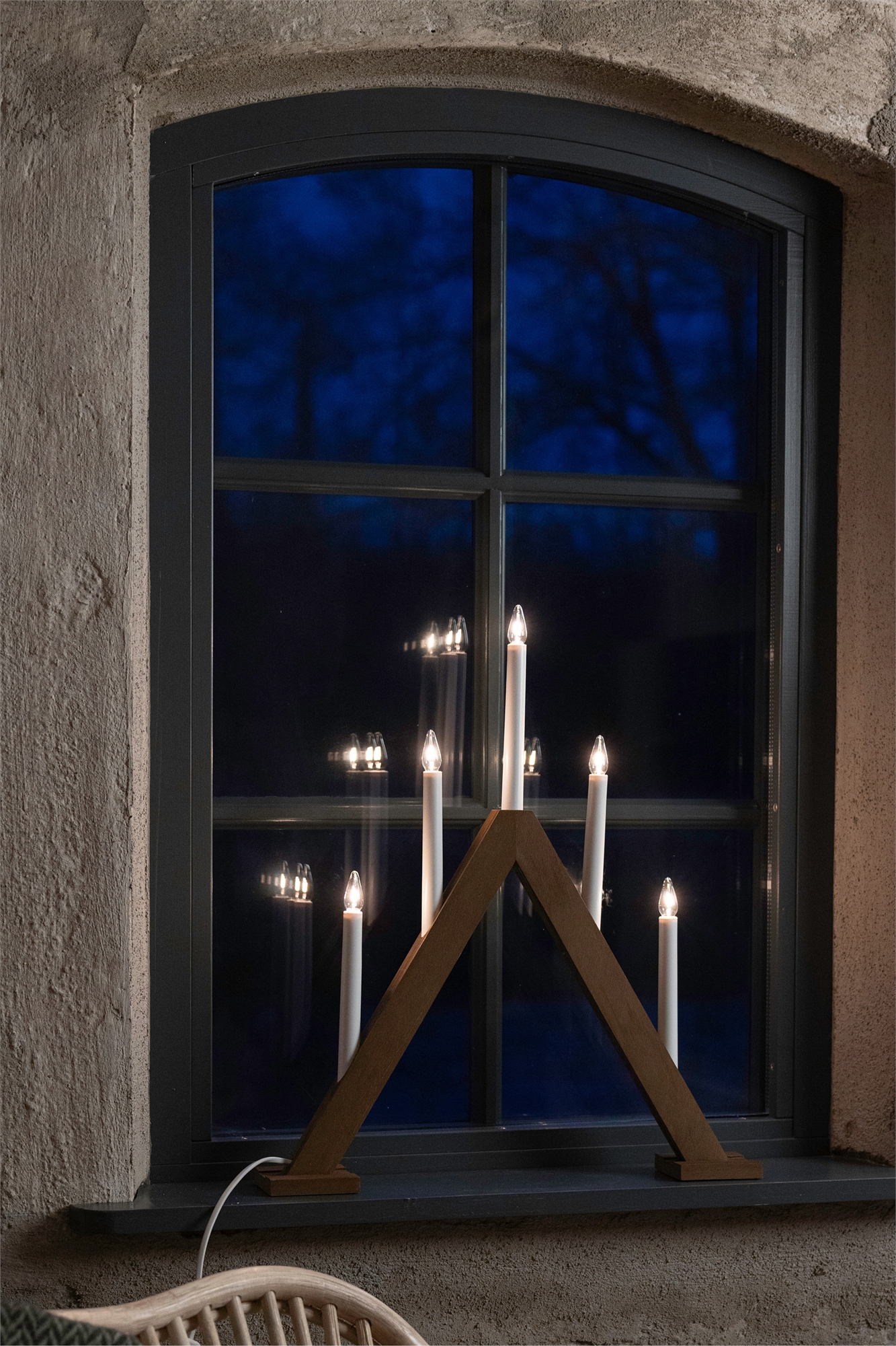Белый адвентный подсвечник с 5 источниками света с цоколем E10 макс. 3 Вт, в комплекте. Белый кабель длиной 2 м с выключателем и вилкой. Размер светильника: 47 см в ширину, 7 см в глубину, 52 см в высоту.