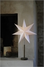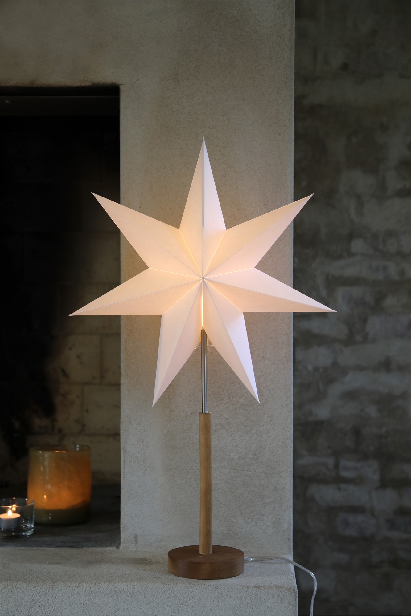 Настольная лампа с белым абажуром в форме звезды из бумаги и основанием из дерева и металла с коричневыми вкраплениями. Для настольной лампы требуется лампа с цоколем E14 мощностью не более 6 Вт, светодиоды в комплект не входят. Прозрачный кабель длиной 2 м с выключателем и розеткой. Размер лампы: 45 см в ширину, 18 см в глубину, 64 см в высоту.