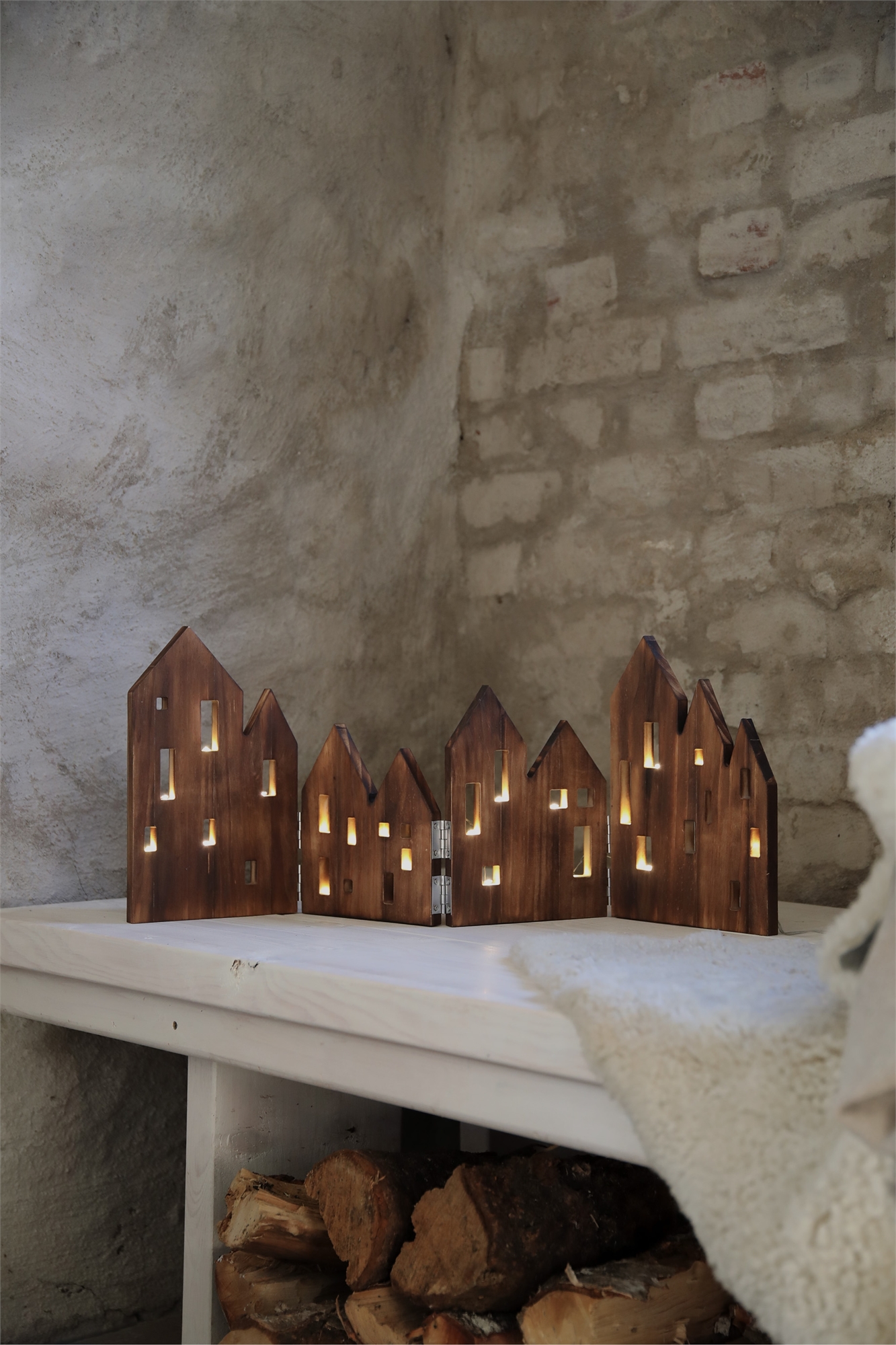 Украшение складного деревянного стола с иллюзией фасадов домов. Фиксированная светодиодная подсветка мощностью 0,9 Вт с 20 маленькими диодами, приклеенными к задней части. Белый кабель длиной 2 м с выключателем и розеткой. Размер лампы: 71,5 см в ширину, 1,5 см в глубину, 28 см в высоту,