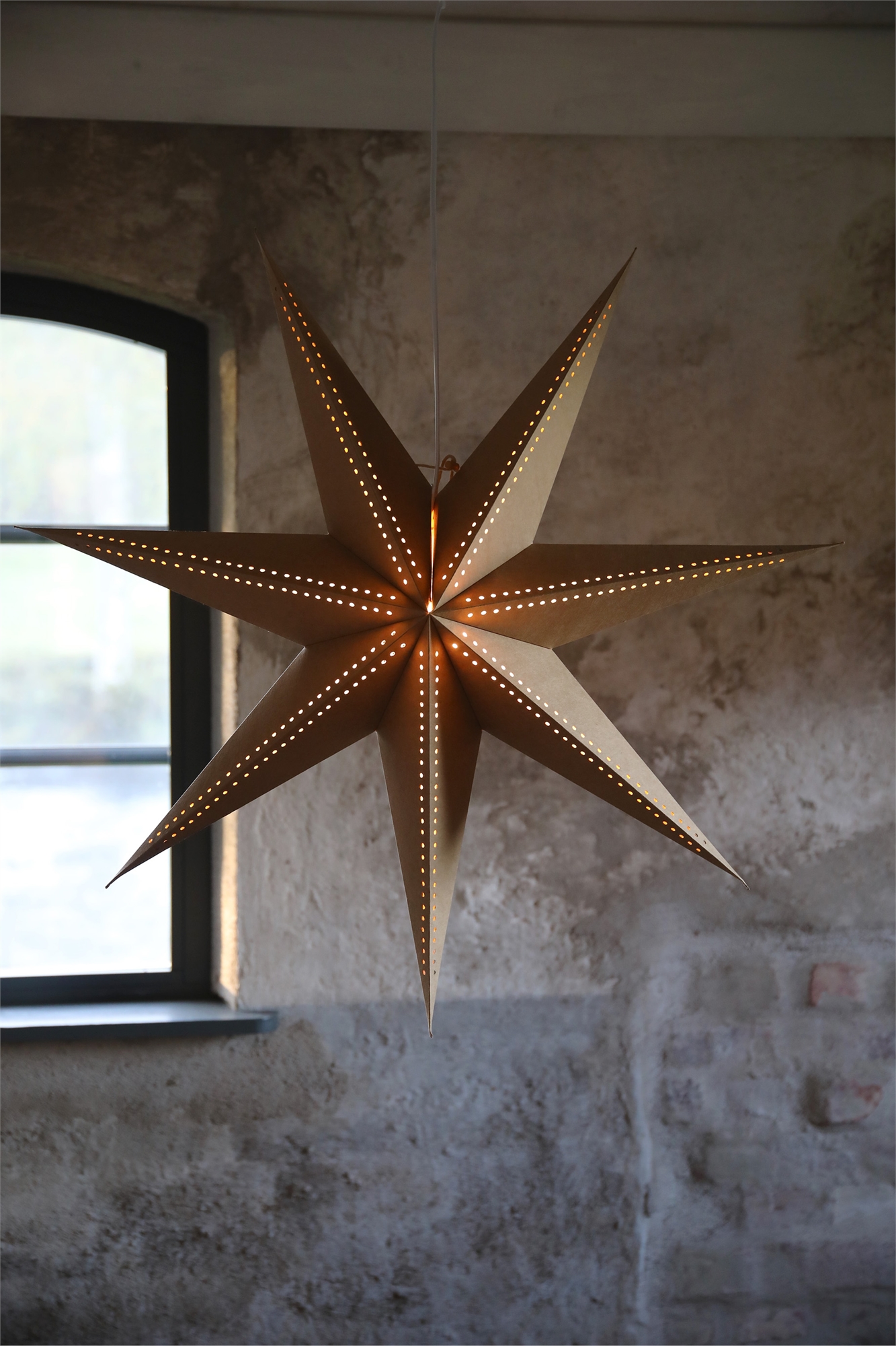 Коричневая подвесная звезда из бумаги с декоративными отверстиями, пропускающими свет. Для звезды требуется лампочка с цоколем E14 со светодиодом мощностью не более 6 Вт, в комплект не входит. Белый кабель длиной 3,5 м с выключателем и розеткой. Размер лампы: 75 ширина, 16 см глубина, 75 см высота.