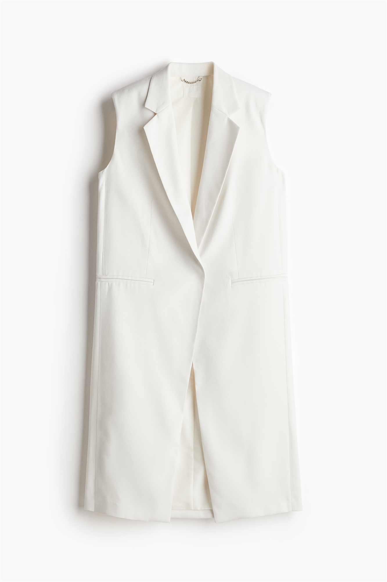 Приталенный жилет длиной до колена из саржи с лацканами с вырезом и открытой передней частью. Накладки на плечах, втачные карманы спереди и регулируемый пояс с D-образными кольцами сзади. На подкладке.