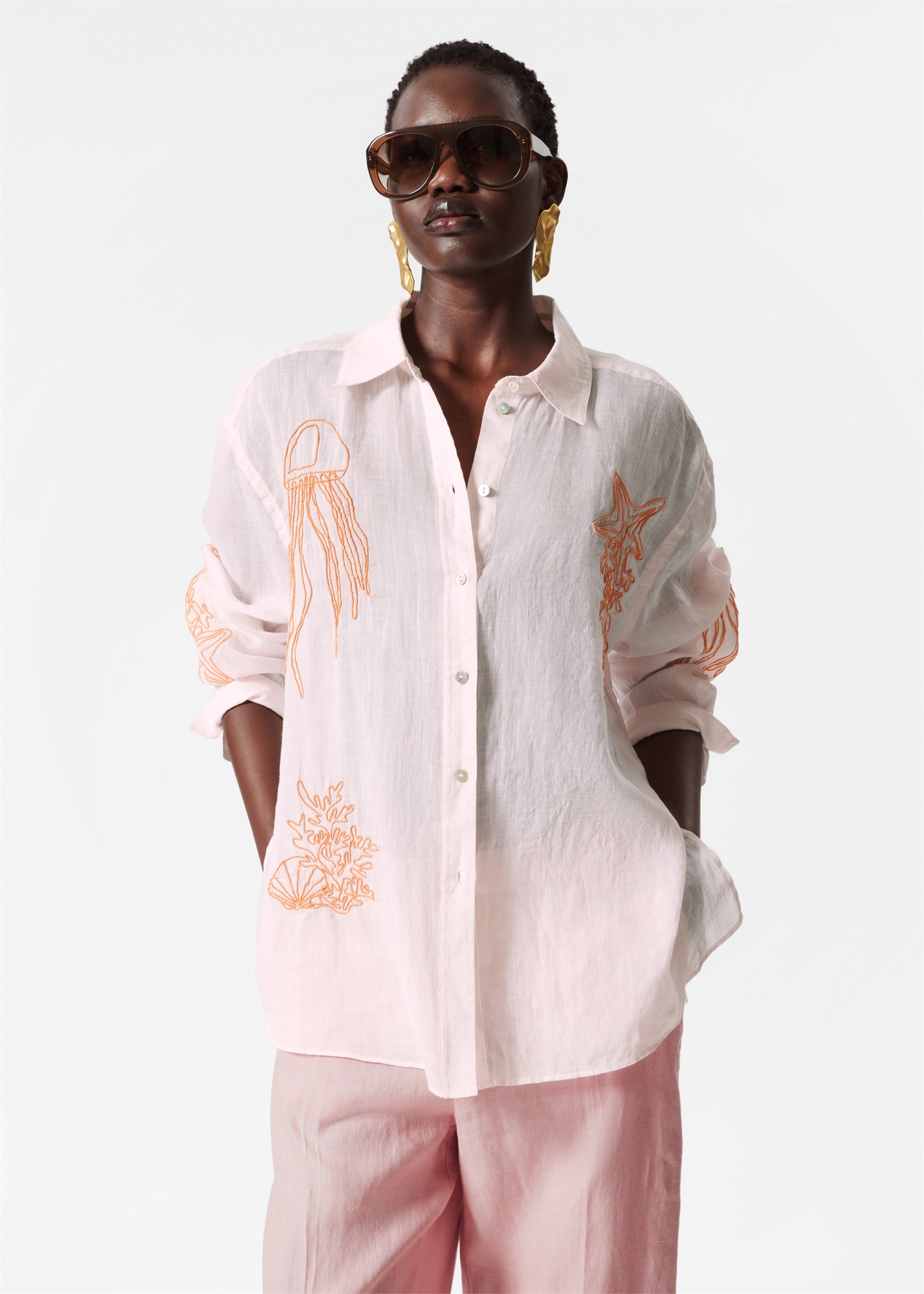 Пусть эта рубашка станет яркой вещью в вашем гардеробе. Она изготовлена из 100% натурального рами, что делает ее легкой и непринужденной. Рубашка имеет свободный силуэт и украшена вышивкой в морском стиле: медузы, морские звезды и водоросли. Классический воротник, манжеты на пуговицах и тонкие разрезы на подоле. Длина рубашки: 72,2 см / 28,4" (размер S)