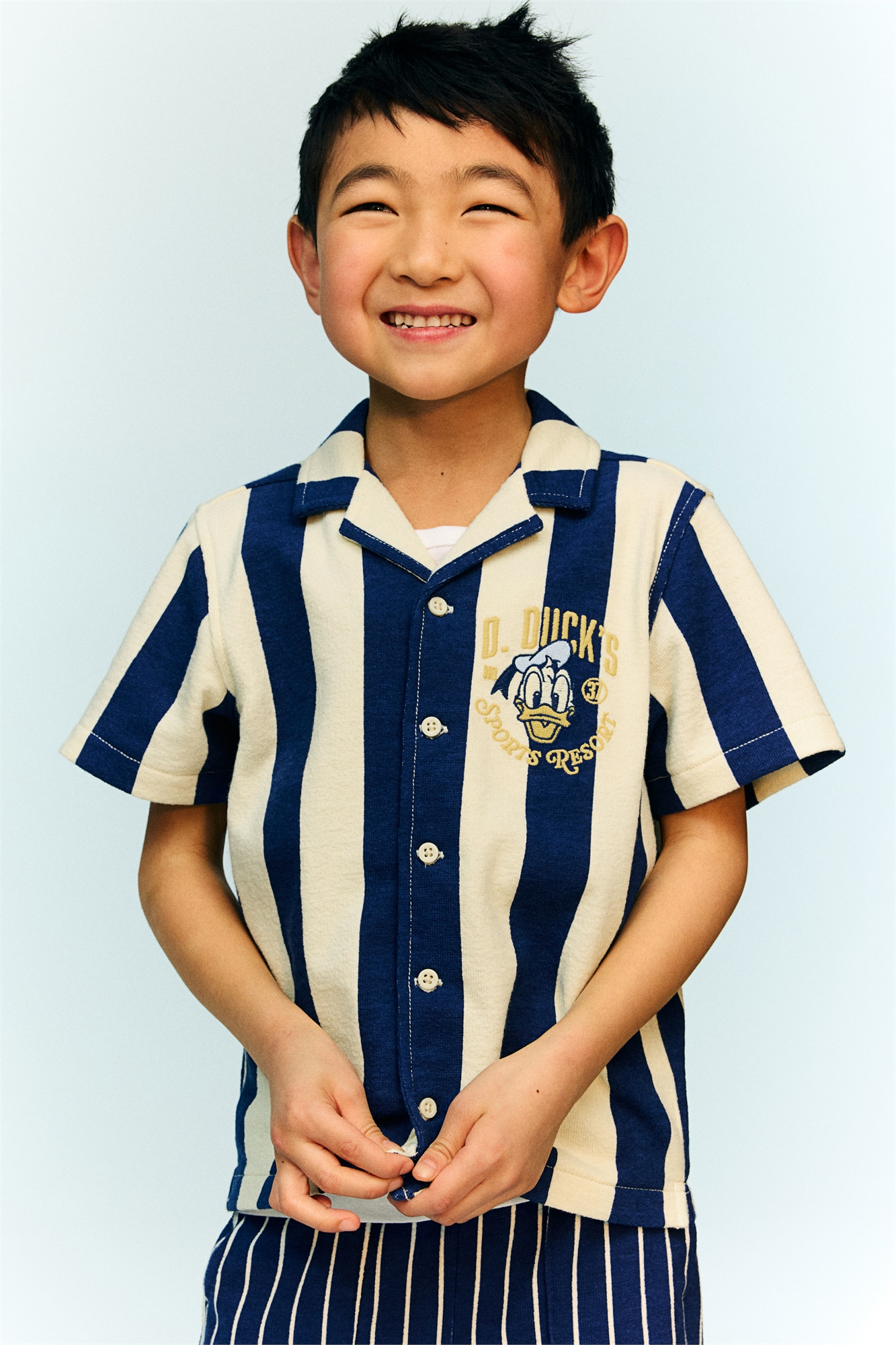 Рубашка из мягкой махровой ткани с вышитым мотивом в верхней части. Курортный воротник, пуговицы спереди и короткие рукава.